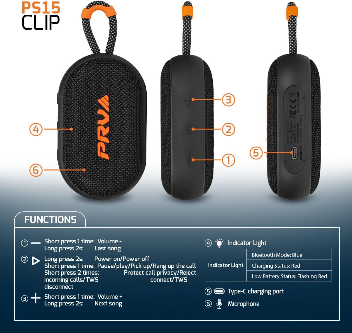 | BuiltIn Media | 1 Portable Bluetooth Waterproof Speaker, Clip, USB-C Charging Cable |