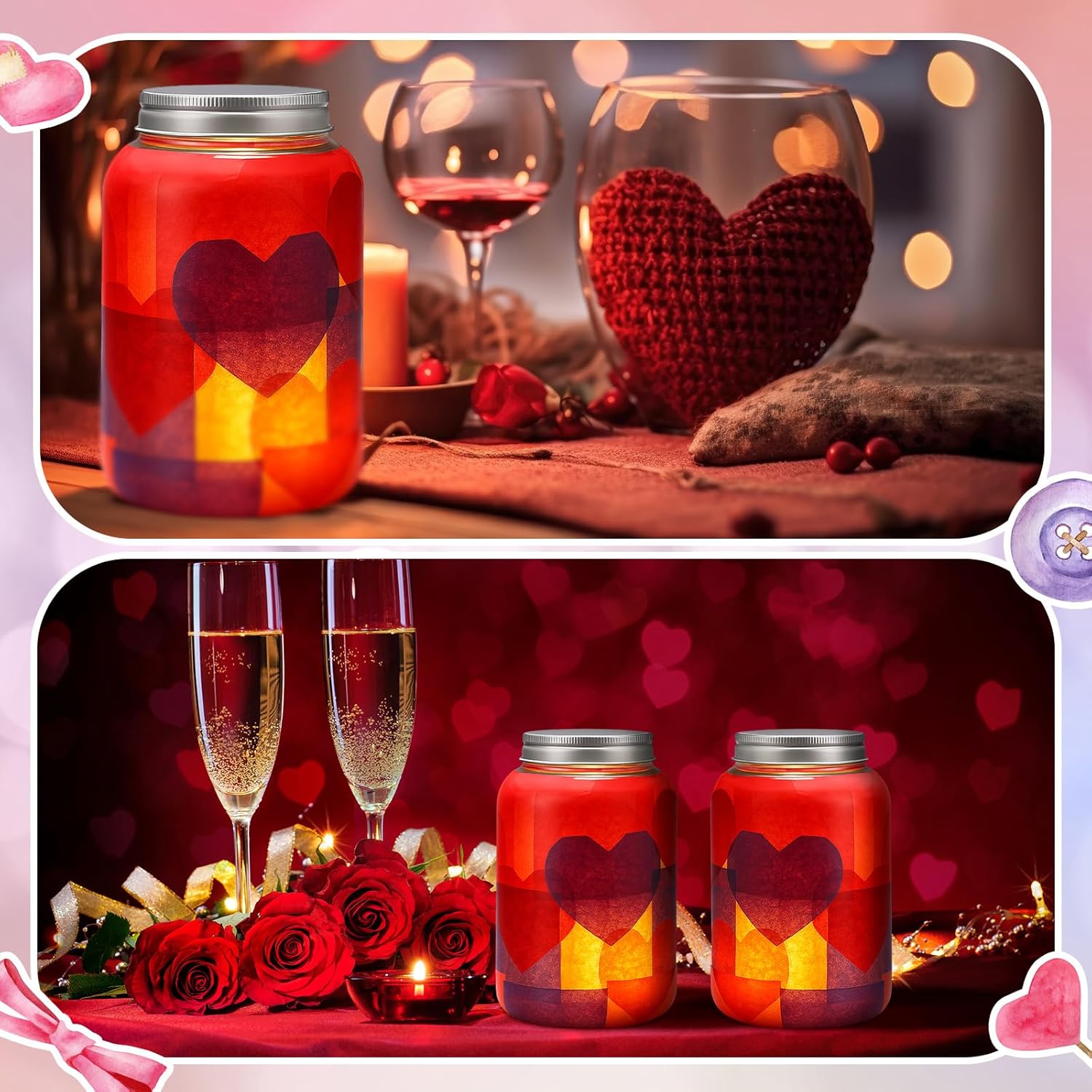Features: DIY creativity galore: With 500 tissue papers, you have endless possibilities for customizing. Create intricate heart patterns, layer colors, or mix and match to suit different Valentine's Day themes. Let your creativity shine! Portable and compact: The size of the mason jars and LED candle lights makes them easy to carry. Take them to a friend's place for a DIY party, or apply them to decorate your picnic basket for a romantic outdoor Valentine's Day. Specifications: Main material: plastic Main color: red, pink, purple Size: Mason jars: 5 x 2.96 inches/ 12.7 x 7.52 cm LED candle light: 1.5 x 1.42 inches/ 3.8 x 3.6 cm Tissue paper: 1.97 x 1.97 inches/ 5 x 5 cm Package includes: 12 x Mason jars with lids 12 x LED candle light 500 x Tissue paper Notes: Manual measurement, please allow slight errors on size. The color may exist a slight difference due to different screen displays. The battery life is related to the frequency and length of application of the product. If the frequency of application is high, and one-time apply long, the battery life will be relatively short