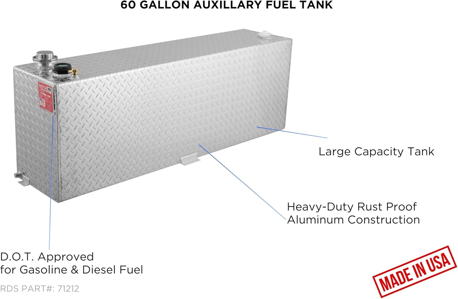 Most RDS transfer tanks also provide auxiliary fueling. RDS offers a full assortment of tanks in various capacities and dimensions to fit your needs. Auxiliary tanks connect to your vehicle’s fuel tank. Diesel fuel can “gravity feed” from the bottom of your RDS tank. An optional Diesel Install Kit contains the necessary items to economically and easily connect your RDS tank to your OEM fuel tank. Gasoline auxiliary fueling is allowed, if siphoned from the top of the tank by using an electric fuel pump.