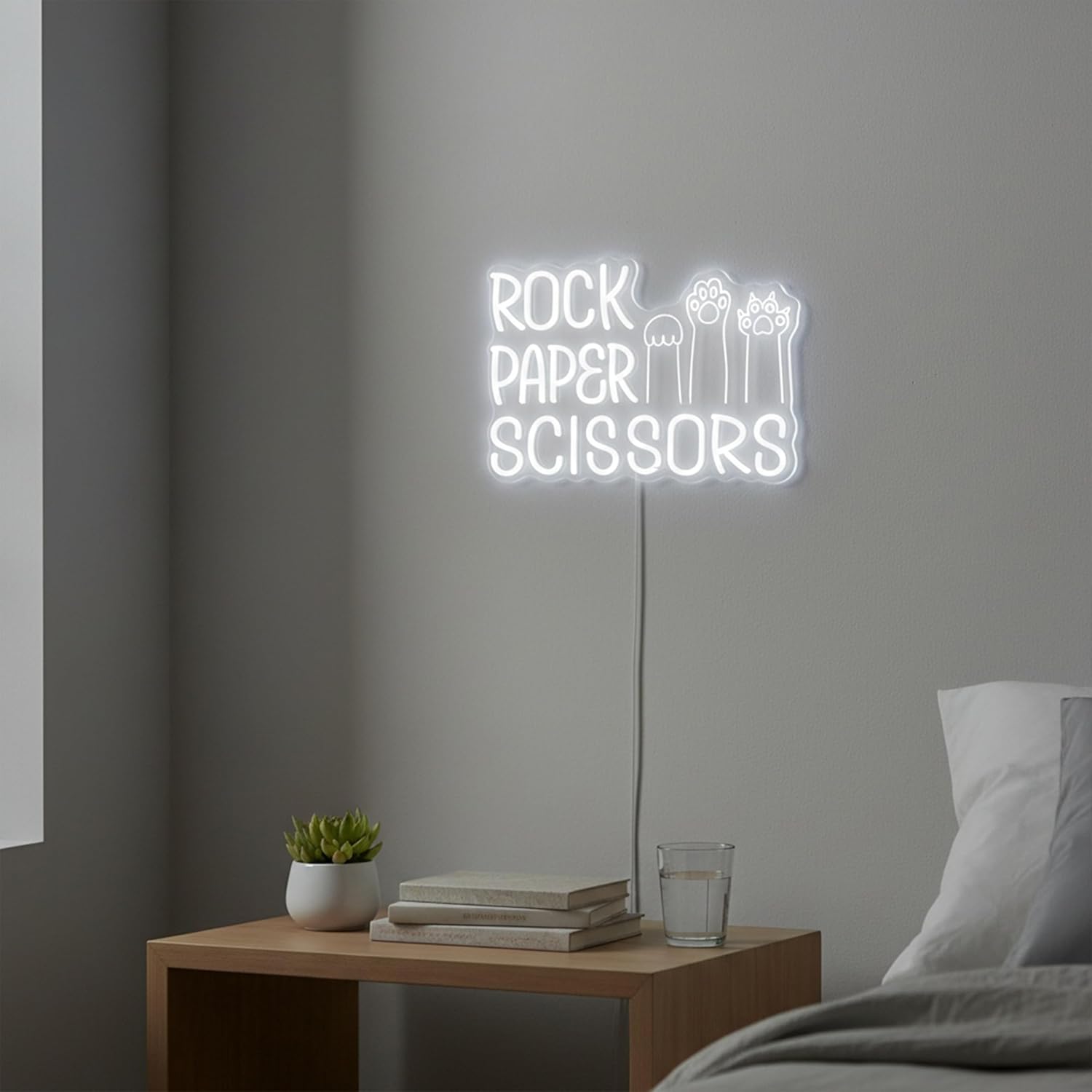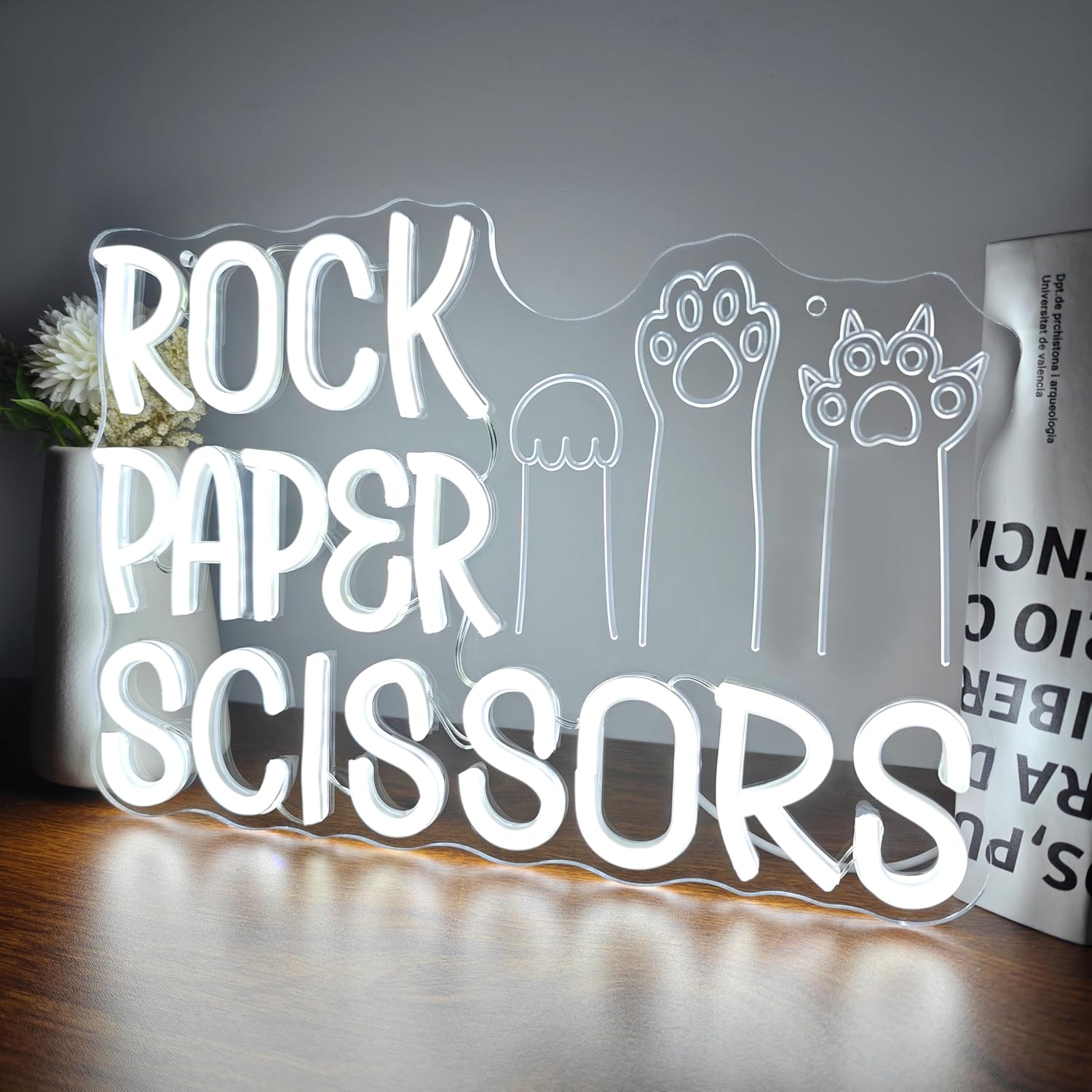 Rock Paper Scissors Neon Sign with Funny Cat Paws Cute Kitty White LED Neon Light for Cat Lovers 13.4" Wall Decor for Kids Room Gaming Room Pet Shop Club Boutique USB Powered with Dimmer SwitchSize of the sign: 13.38 x 9.44 inchesColor: cool white Material: acrylic, silicone