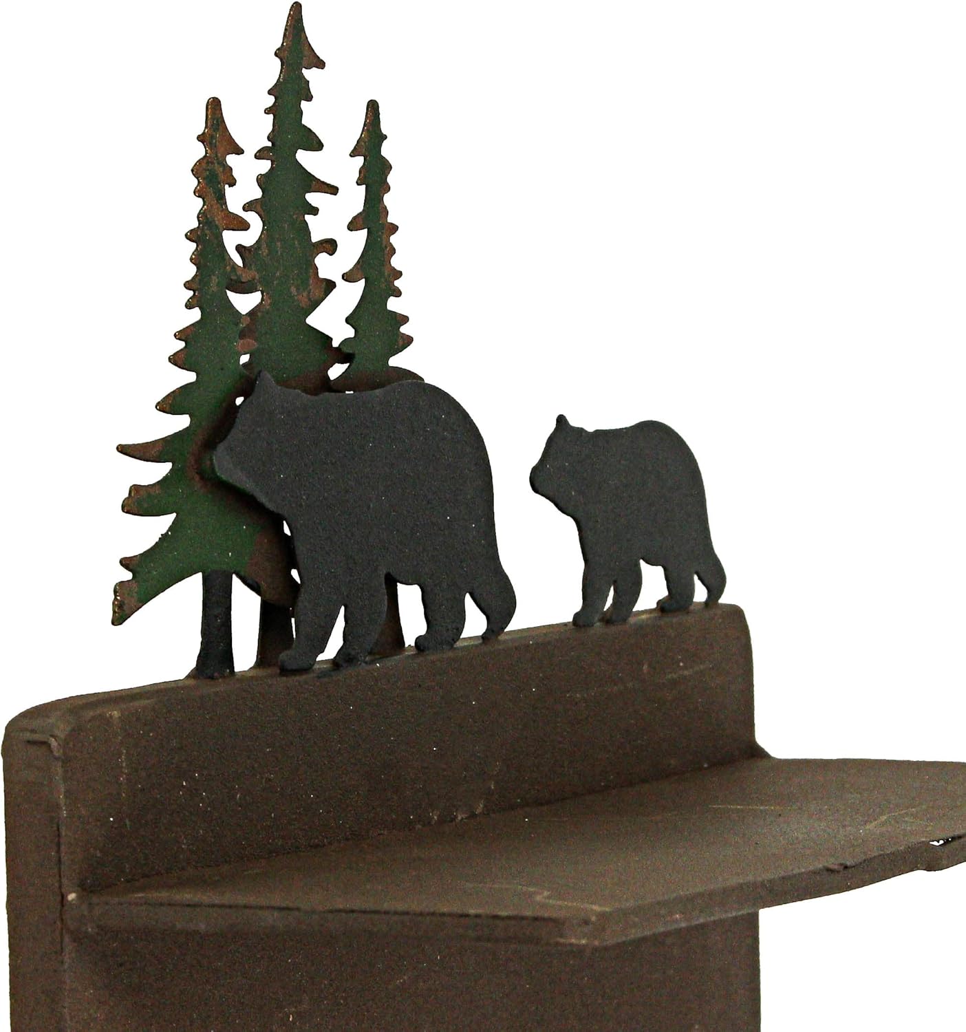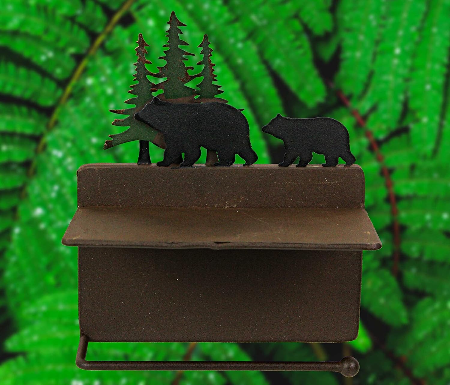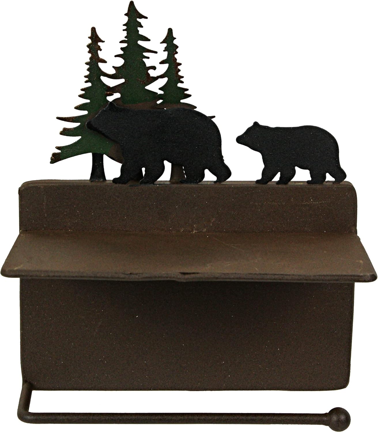 This wonderful walking bears in the woods wall-mounted toilet paper roll hanger is a perfect accent to any Western or Lodge-themed bathroom. Made of metal, the holder features a welded side-install roll holder and has a rustic brown metal finish with hand-painted bear and tree accents to match almost any decor. A small shelf sitting above the roll makes a perfect place to hold your phone while you take care of business. The holder measures 7.25 inches wide, 4 inches in projection, and 8.5 inches high. It's easy to mount, using the pre-drilled holes spaced approximately 6.25 inches apart(screws not included).