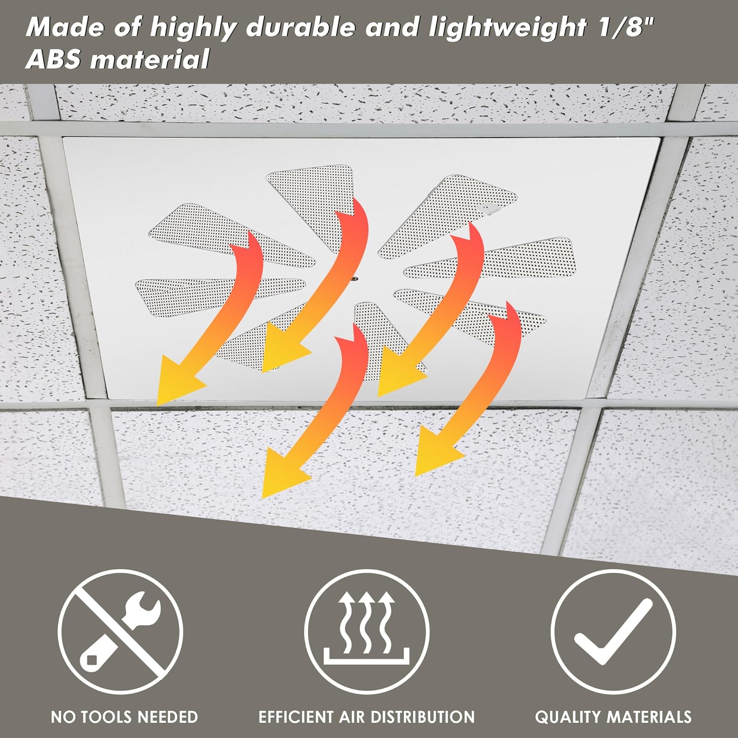 With this AC vent cover, one simple motion allows you to control the temperature of your workspace. No more shivering under direct AC blow, regulate your own environment with ease! Specification: Color: White Package: 1 x Adjustable Air Conditioning Vent Cover Caps Dimensions: 24"L x 24"W x 0.16"H (Fits the standard 24" x 24" drop ceiling AC grate. )