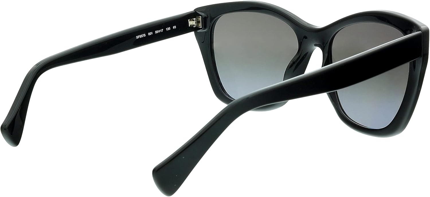 Salvatore Ferragamo Sunglasses. Series number: SF957S. Color code: 001. Shape: Cat Eye. Lens Width: 56 mm. Lens Bridge: 17 mm. Arm Length: 135 mm. 100% UV protection. Non-Polarized. Frame Material: Plastic. Frame Color: Black. Lenses Type: Grey Gradient. Rim Style: Full-Rim. UPC/EAN code: 886895421775. Salvatore Ferragamo Grey Gradient Cat Eye Ladies Sunglasses SF957S 001 56. Manufacturer's Packaging Included. Packaging Size And Color May Vary.