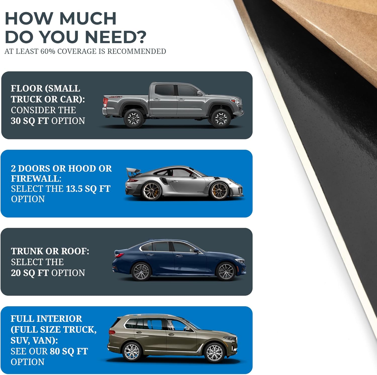 | Recommended Uses For Product | Automotive sound deadening, Reducing noise and vibrations in vehicles, Sound deadening for cars, hot rods, trucks, Jeeps, and RVs |
