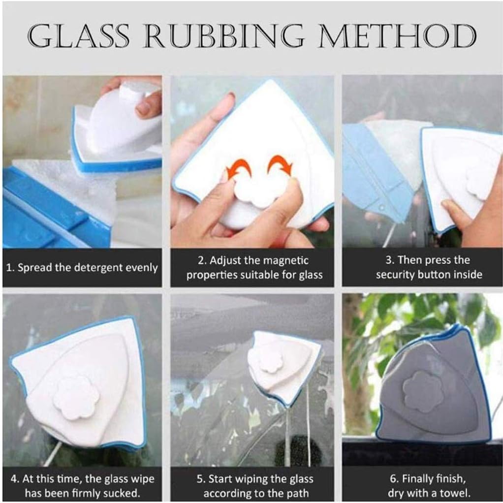 Product descriptionFeatures:1. triangular shape design, 360 degrees without dead ends, easy to clean the window.2. The magnetic adjustment knob rotates the magnetic force clockwise and rotates the magnetic force counterclockwise.3. Made of high-strength abs material, it is more .4. Can be inserted into the wiper strip, resistant to acid and alkali, does not hurt the glass, , more convenient to replace.5. Super strong magnetic, more .6. Almighty clean king, suitable for window glass, glass partition, glass sliding door, bathroom glass, bathtub glass, etc.Specifications:Name: Adjustable magnetic sided glass wipeMaterial: Abs + ndfeb magnet + rubber stripType: Double-sided wipeApplicable: 3-24mm (thickness) full model glassSafety rope length: About 170cm/66.93inPackage inluded:1 x adjustable magnetic glass wipeMulti-purpose Glass Scraper: The glass scraper is ideal for cleaning the glass palette, oven, cooktop, ceramic top, and glass stove. Also is a sticker remover, which can help you remove stickers, decals, glued characters, labels, paint, paper, and carpet glue off the window