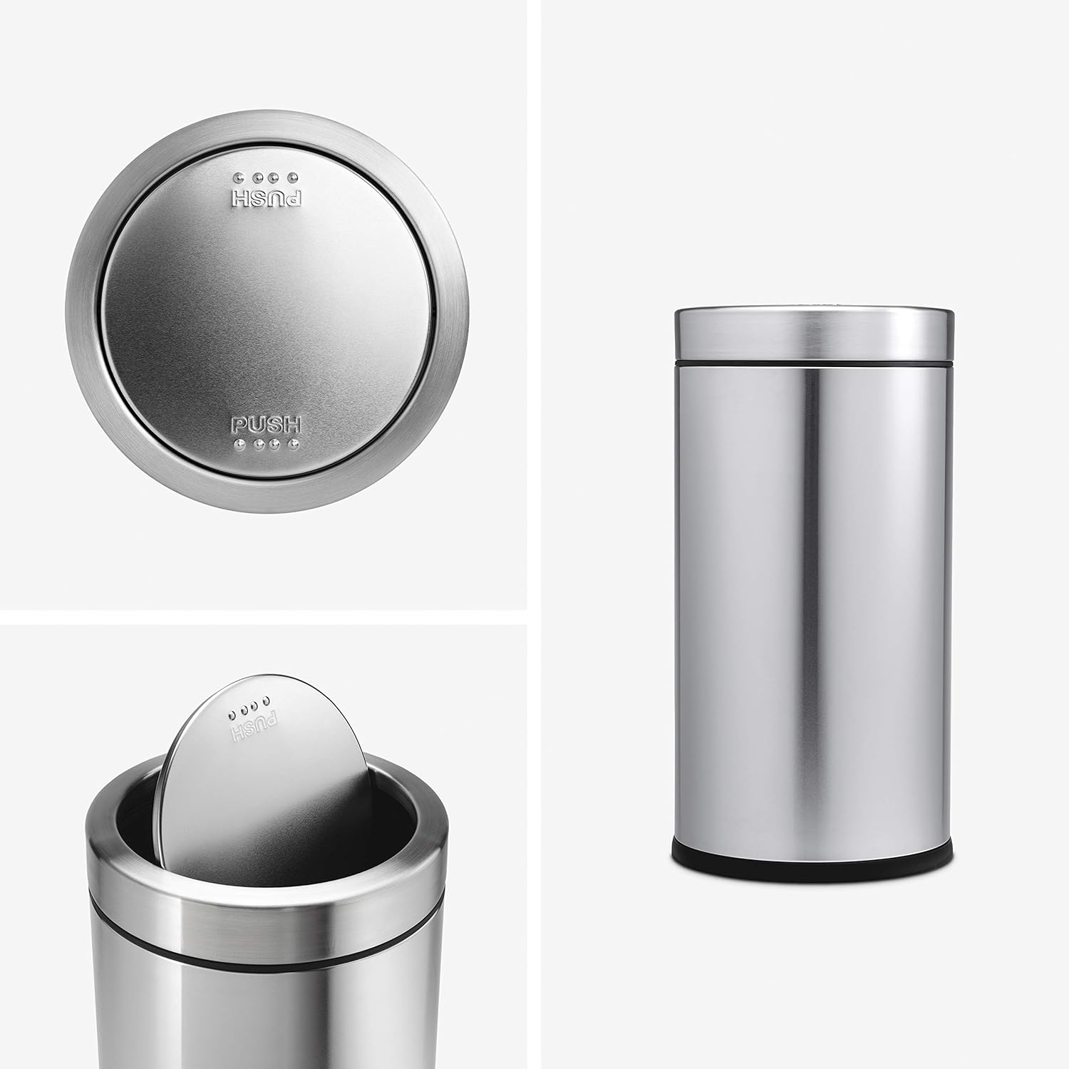 simplehuman 55 Liter / 14.5 Gallon Commercial Swing Top Trash Can, ADA-Compliant, 11-20 Gallons, Brushed Stainless Steelsimplehuman's swing top can has a perfectly balanced swing lid that opens easily and then gently swings back into place. The sturdy stainless steel construction, lift-off lid, and large capacity make it an ideal choice for commercial spaces such as restaurants and coffee shops, or even busy families.simplehuman 4.5 Liter / 1.2 Gallon Round Bathroom Step Trash Can, Brushed Stainless SteelThis compact classic round step can is perfect for smaller spaces like a bathroom or an office. The strong steel pedal is built to last, and lid shox technology ensures a smooth, silent close every time. A removable inner bucket makes for easy trash disposal. Try our custom fit liners for this can extra strong and a perfect fit.