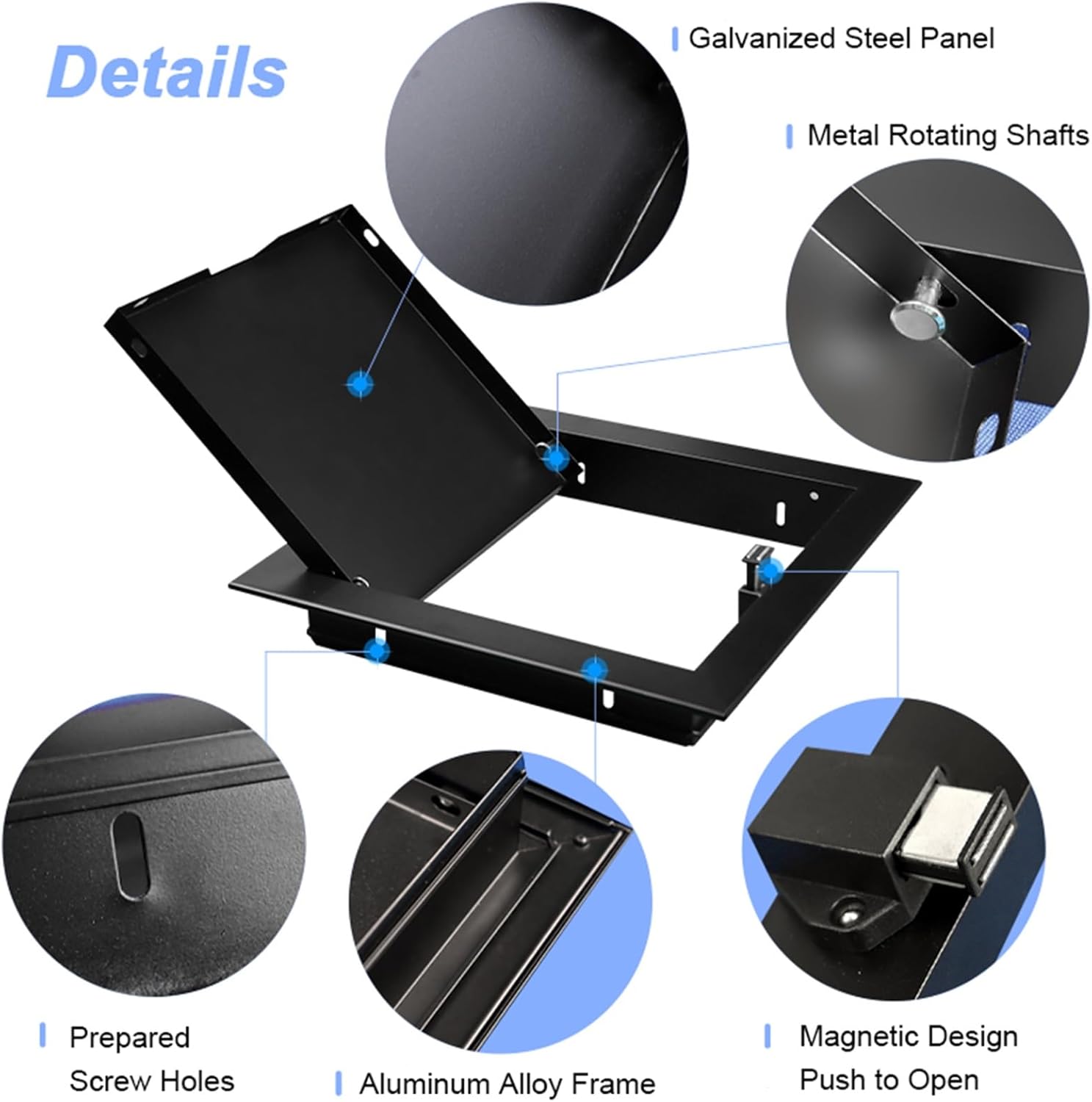 \u200bWall and ceiling inspection port (be sure to accurately measure the size of the opening you have reserved, and select the specification that best fits the opening size from the options)Tired of visible openings ruining the aesthetic of your space?Are you frustrated by visible pipes and wires?Generic access panels easily cover exposed holes and cables in your walls, and their openable structure allows for quick and safe inspection and repairs.Specification:Material: Aluminum Frame + Galvanized PlateColors: blackSize = Hole Opening Size: Customisable Outer diameter: hole diameter (order size) + 1.38Inner diameter: hole diameter (order size) - 0.2inFrame Depth: 1.38inFrame Width: 1inIdeal For: Walls and ceilings in homes, offices, or commercial buildingsFeatures:1. Easy to install/open/close.2. Hide unsightly openings.3. Aluminium materials are stable and sturdy enough.4. Access can cleverly conceal messy wiring and keep the space tidy and organised.5. Application: pipe wells, water meter boxes, fire hydrants, distribution boxes, fire doors, inspection doors.What‘s in the Package? 1 x Access Panel Note: Product size pure manual measurement, the error in 1-2cm, the specific subject to prevail.It's can't avoidable that you will receive the backpack with some smells from original material as it's brand new. The smell will be gone if place the backpack in freely circulating air for 2-5 days.Material: Aluminum Frame + Galvanized Iron Plate