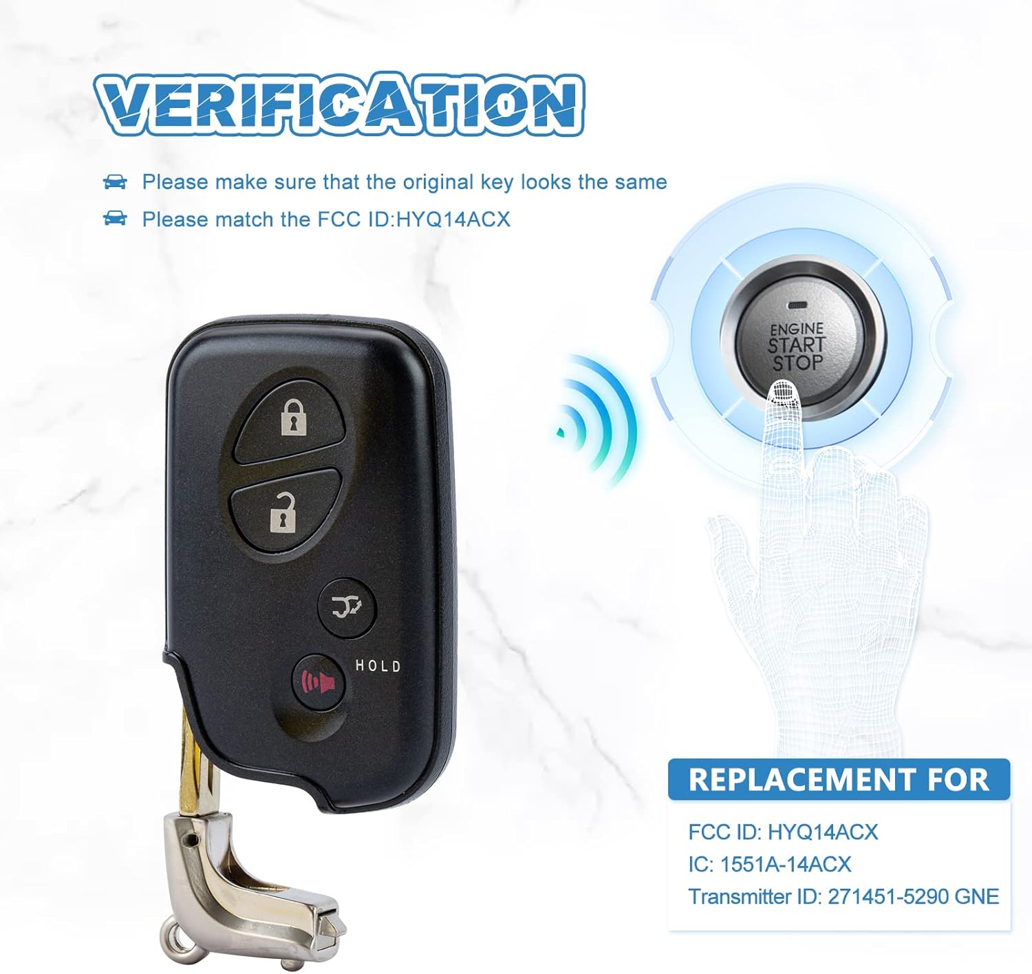 ★ Lost your key? or just need an extra one? Look no further ★ FCC ID: HYQ14ACX IC: 1551A-14ACX Transmitter ID: 271451-5290 G N ECompatible with : *2009-2015 RX350 *2010-2015 RX450h *2010-2016 GX460 *2008-2013 LX570 *2011-2016 CT200hPlease Note: Your Original Remote Must Be With FCC ID: HYQ14ACX and Looks Identical. Smart Remote Must be Programmed by Locksmith or Dealership. Please make sure the remote programming can work to your vehicle before asking the locksmith to cut the key. Don't wait for him to cut the key and discover that it does not work, which may make a loss. If the locksmith declares that the key is purchased online or is not an original part, or other reasons to cause it can't work normally, and guides you to buy a new one in his store, you'd better find another locksmith to try