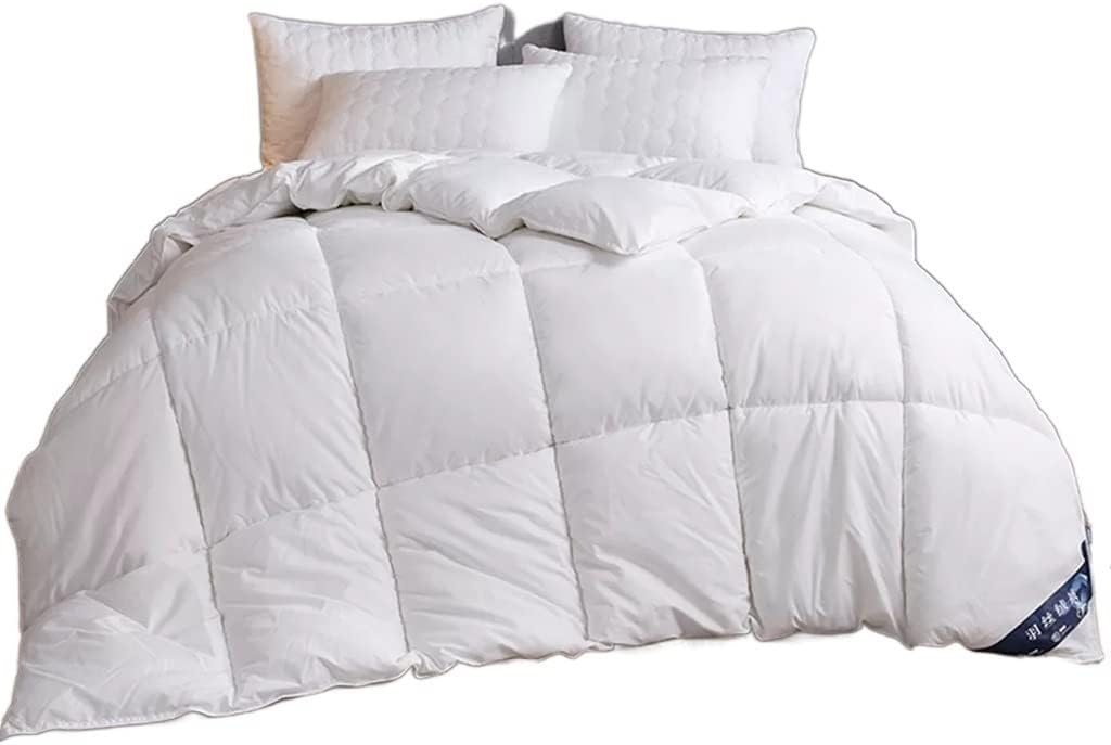 Super soft to the touch and noiseless, allowing your body to breathe at night. Provides optimal warmth, for cold winter climates/sleepers.pinch pleat design delivers elegant and timeless good looks. The Deluxe Duvet has a medium weight for year-round comfort.The down comforter is the gold standard for fluffiness, ensuring maximum long-lasting cloud-like loft.With maximum loft and warmth. Cord loops and sewn-in corner tabs are designed to hold the duvet cover in place.Extremely soft, breathable, and non-allergenic. stitched design to prevent down leakage.Washing methods.1. Dry cleaning is recommended. Dry at low temperature.2. Wash in cold water up to twice a year. Does not need to be washed often. Keep it clean with a cover when using.Package1*quilt core (excluding pictures and other demo products)Caution1. Due to manual measurement, please allow 0~1 inch error. Thank you for your understanding.2. 2. Please assume that the color may vary due to the different color ratio of the computer.