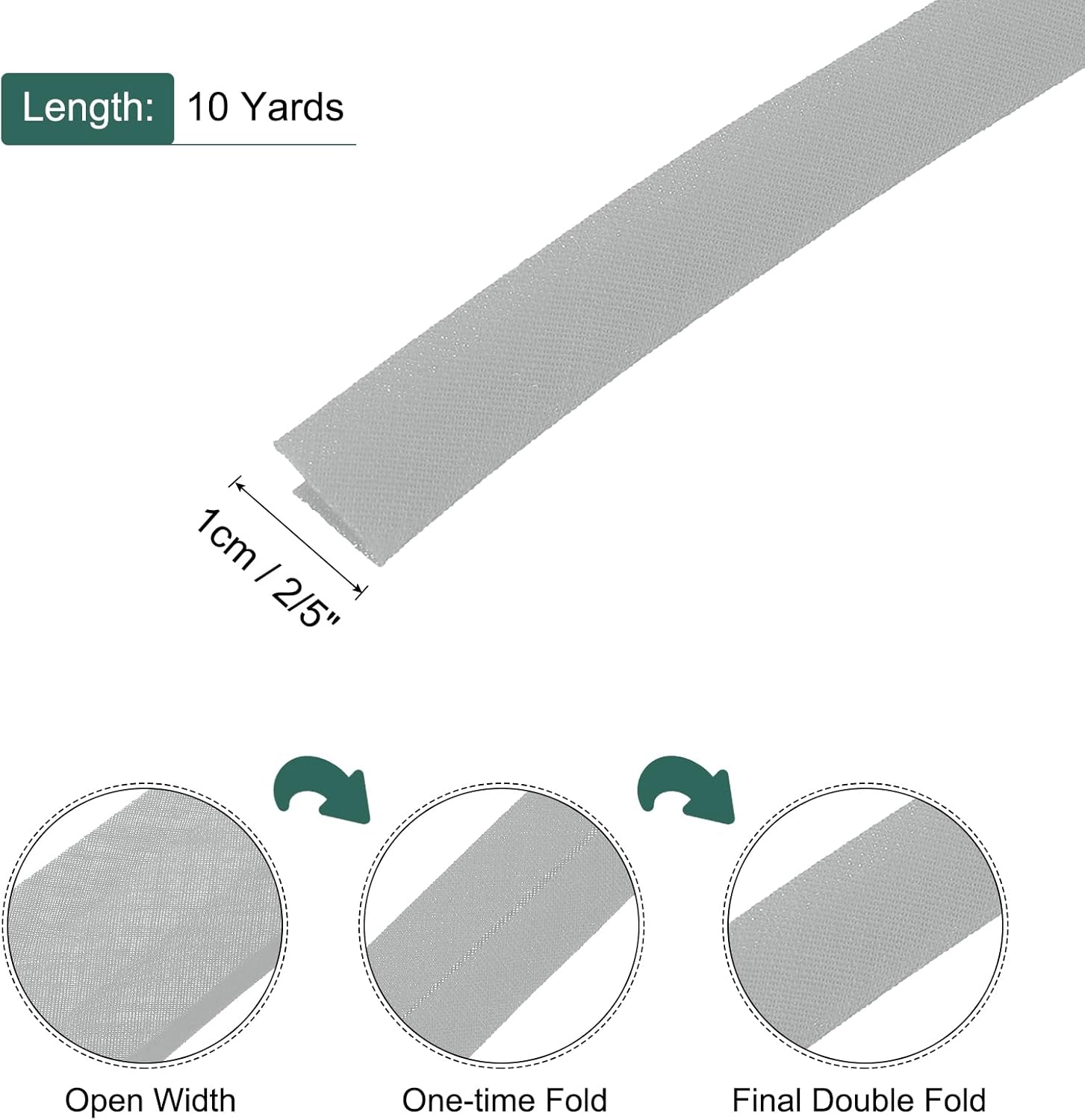 What is this?The product has a wide range of applications, perfect for your bias tape maker kit, machine and hand; Satisfies your needs for sewing, trimming, binding straight and curved raw edges, hemming, garment making and sewing,Christmas aprons, hats, ties, Different requirements for quilts, placemats, cups, and tent materials.What will I get?Package contains: 1 x Double Fold Bias Tape;Width: 2/5 inch (1cm);Length: 10 Yards;Color: Grey;Material: Polyester Cotton;Is there any advantages of the product?The product is made of polyester and is bevel-cut with folded edges of equal width and folded in the center; It has no stretch, so it is not an elastic band and is suitable for sewing;The product is not stiff and is soft after washing and does not require ironing; Does not fade; Machine and hand washable; Odorless.How to use it?The product is easy to use with a variety of fabrics, easy to match cotton, polyester, leather, canvas and linen, and you can cut the tape to any size you want.What should I notice?Due to the length and nature of the textile, the tape is not completely continuous, but our extra wide bi-fold bias tape sews well and is strong, durable and continuous.