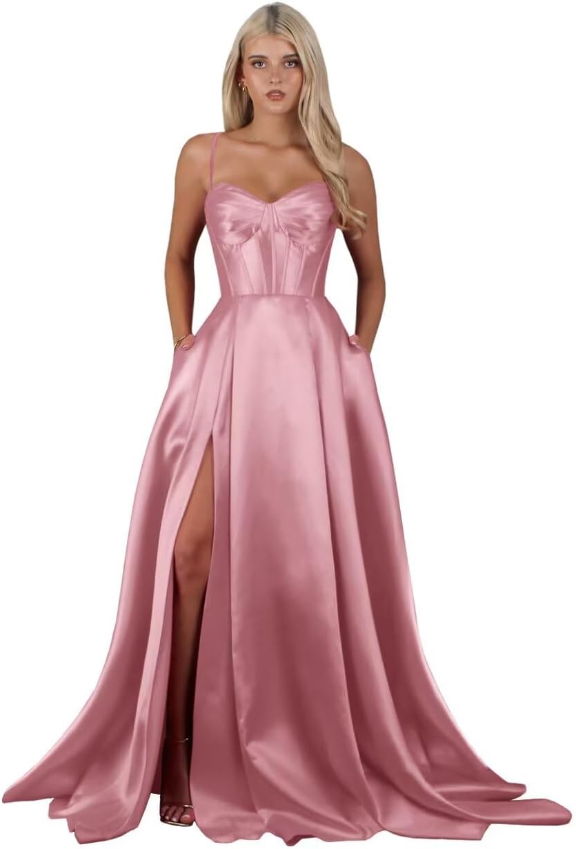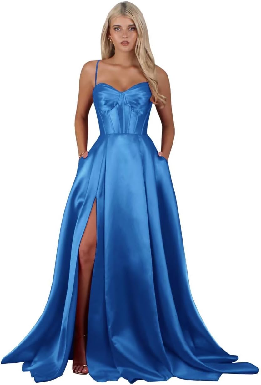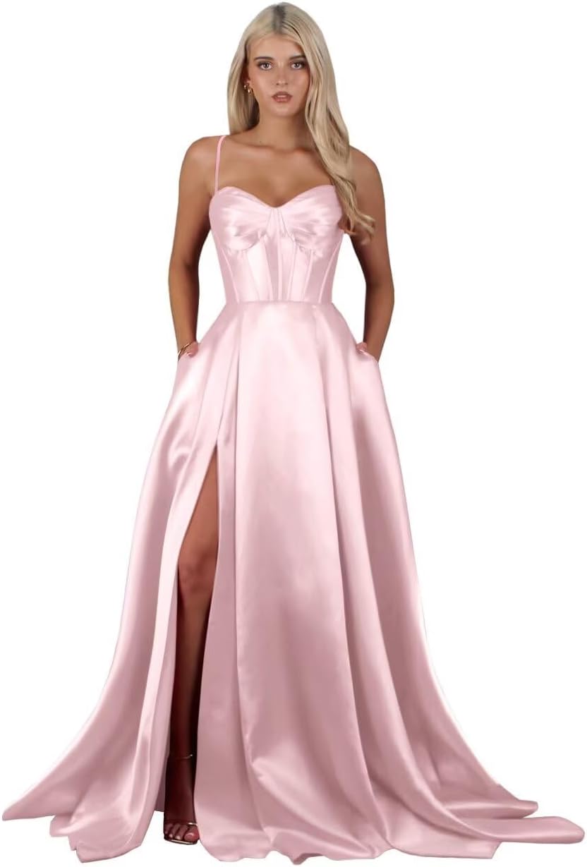 | Fabric Type | Long Satin Spaghetti Straps Slit A Line Prom Dress with Pockets |