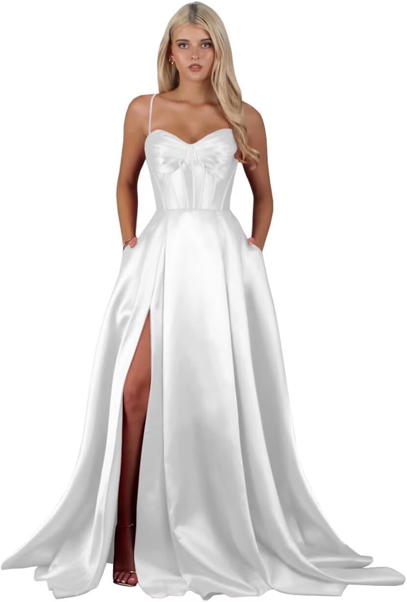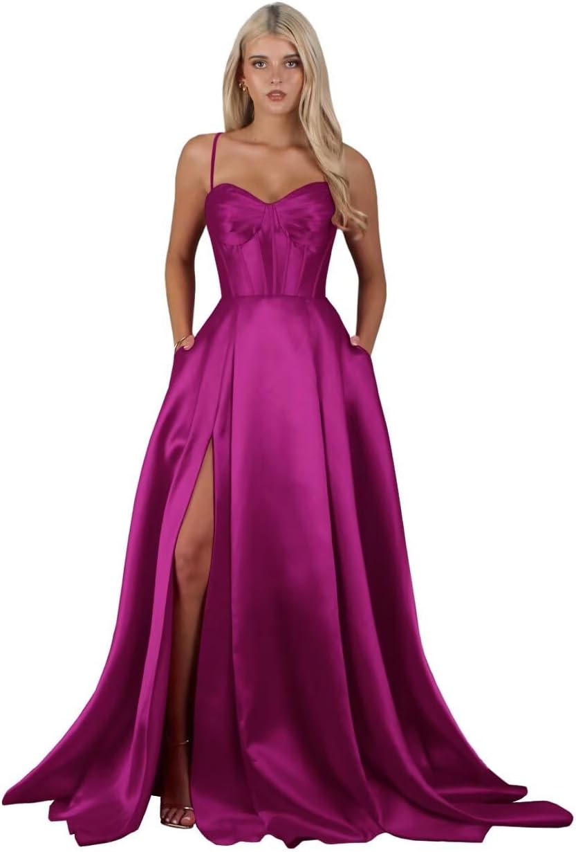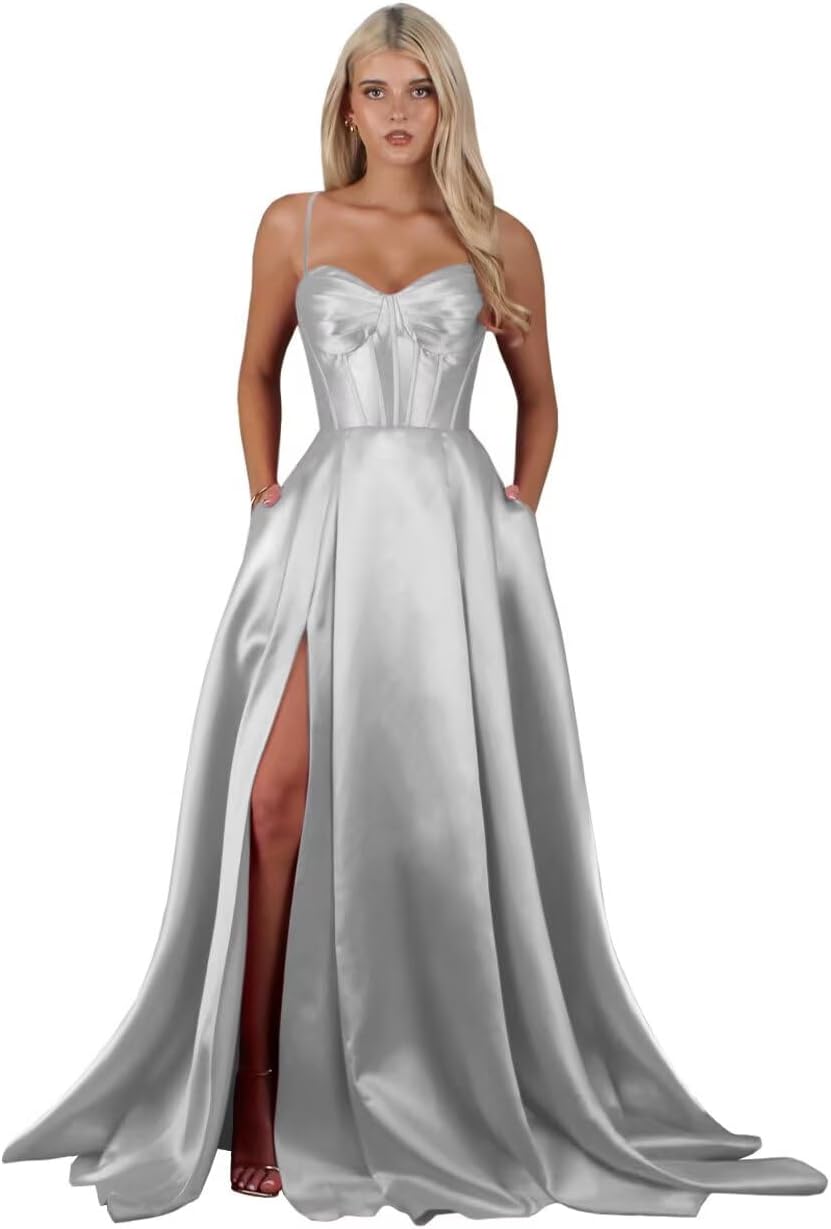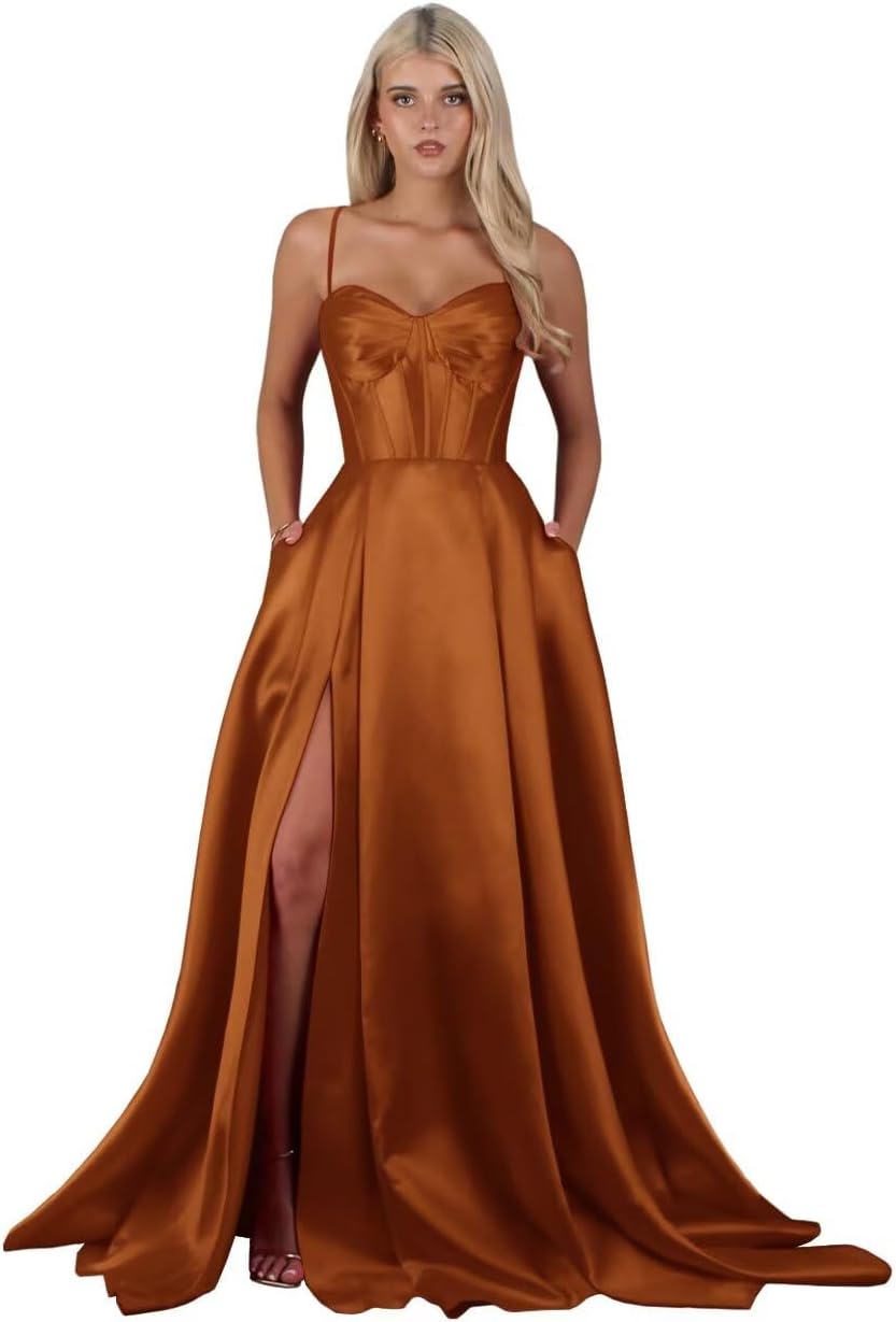 | Fabric Type | Long Satin Spaghetti Straps Slit A Line Prom Dress with Pockets |