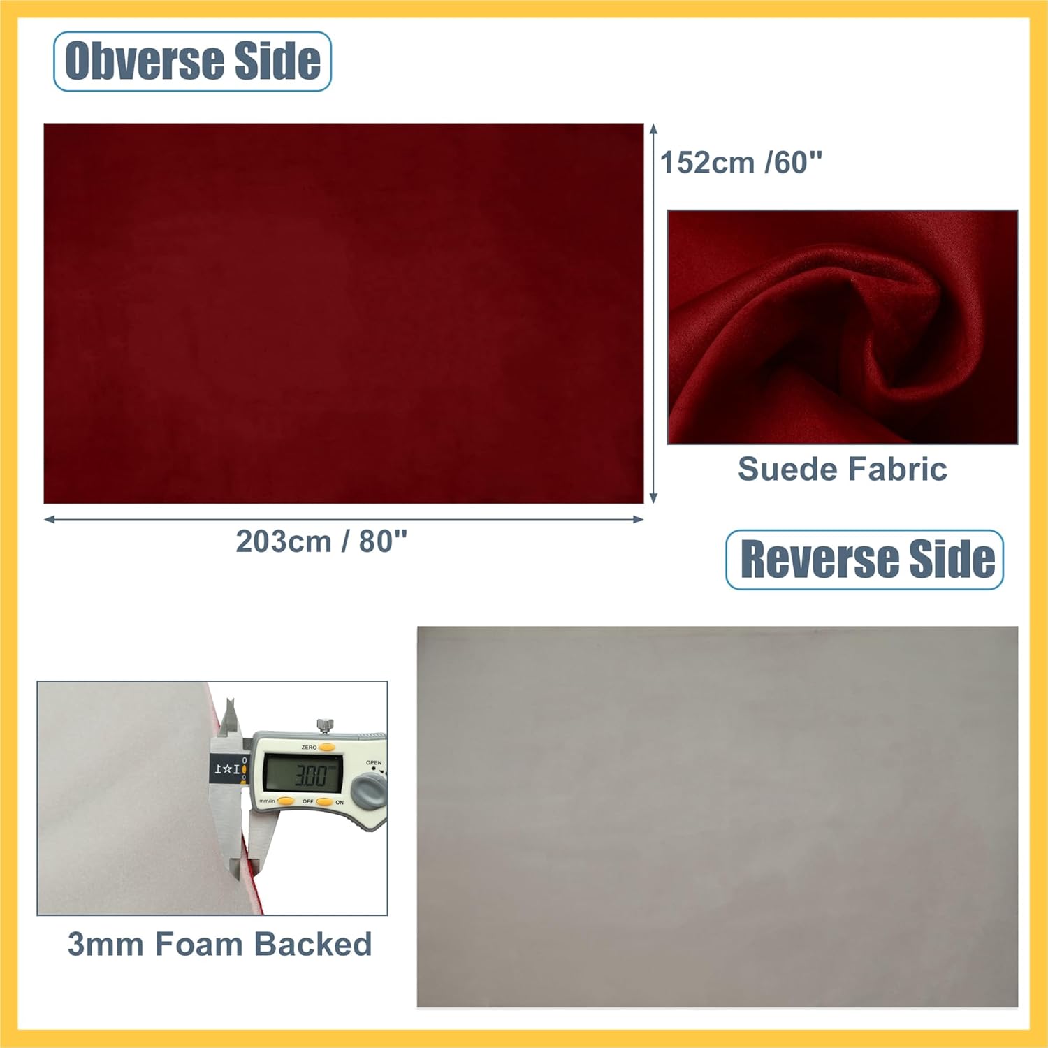Feature:Application: Widely applied for cars, trucks, RVs, SUVs, marine, and boats. This material does a good job in interior trim upholstery, roof ceiling, and steel wheel carpet lining, aging broken faded DIY repair replacement.Made of good material, the fabric is soft and durable.Soft fabric with foam backing is a good choice for replacing your roof headliner, giving your car a new look.Please allow 1-5cm differences due to manual measurement.Specification:Size: 203x152cm / 80"x60"(L*W)Color: RedMaterial: Suede Fabric (3mm Foam Backed)Package Included:1 Pcs Car Headliner Repair Fabric