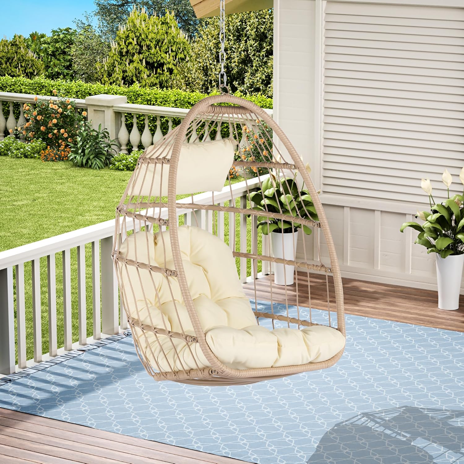 Features:【High-Quality Materials】This Hanging Chair with All-in-one Seat, Back and Arm cushion also features Zippers to Easily Remove the Inner Cushions for Cleaning; The whole frame is made of Powder coated metal, and the frame and seat surface of the Egg Chair are made of rattan ,it's safe enough to accommodate an adult to swing. Safety strap helps keep the chair safely in place while getting in and out of the chair.【Portable and Foldable Design】Foldable design makes it more convenient for you to carry. You can carry it to anywhere you want.【Great for Indoors & Outdoors】Egg chair is designed to be used inside or outside; Chair, Chain and Cushion combo makes it easy to add a stylish seat to an apartment without having to permanently install it into the ceiling; Makes a wonderful addition to the patio, deck, garden, yard, backyard, porch, bedroom, living room and other places around your home.【Easy to Assemble and Use】The assembly-guide and pieces are all included. It allows you to simply punch a hole in the ceiling, insert a hook, and hang the hammock egg chair in the living room, bedroom or garden. You can also hang it directly under a tree or from a sturdy pole, just attach the chain and enjoy your personal outdoor time.【Dimension and Weight Capacity】The hanging egg chair size: 28.7”(W) x 28.5”(D) x 55.6”(H); Weighs 24 lbs; Weight Capacity: 300 lbs.Specifications:Product Type: Hanging ChairSeating Capacity: 1Chair Material: PE RattanChain Material: Stainless SteelCushion Material: PolyesterHeadrest Pillow Material: PolyesterFoldable: YesChain Included: YesWith Stand: NoWeight Capacity: 300 lbsDimension: 28.7”(W) x 28.5”(D) x 55.6”(H)Weight: 24 lbsNumber of Packages: 1Package Included:1x Chair1x Chain1x Hardware1x Manual1x Cushion1x Headrest Pillow