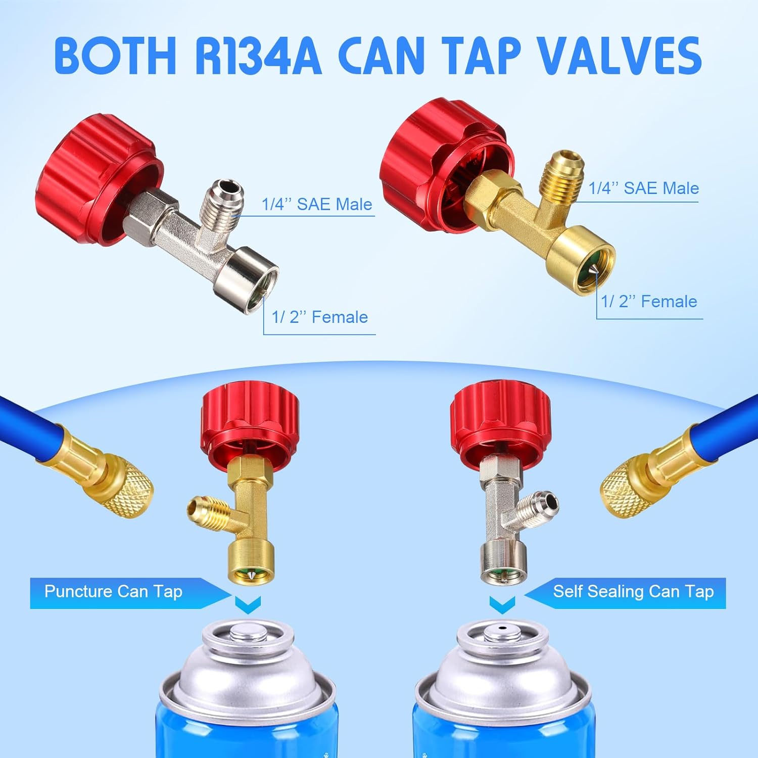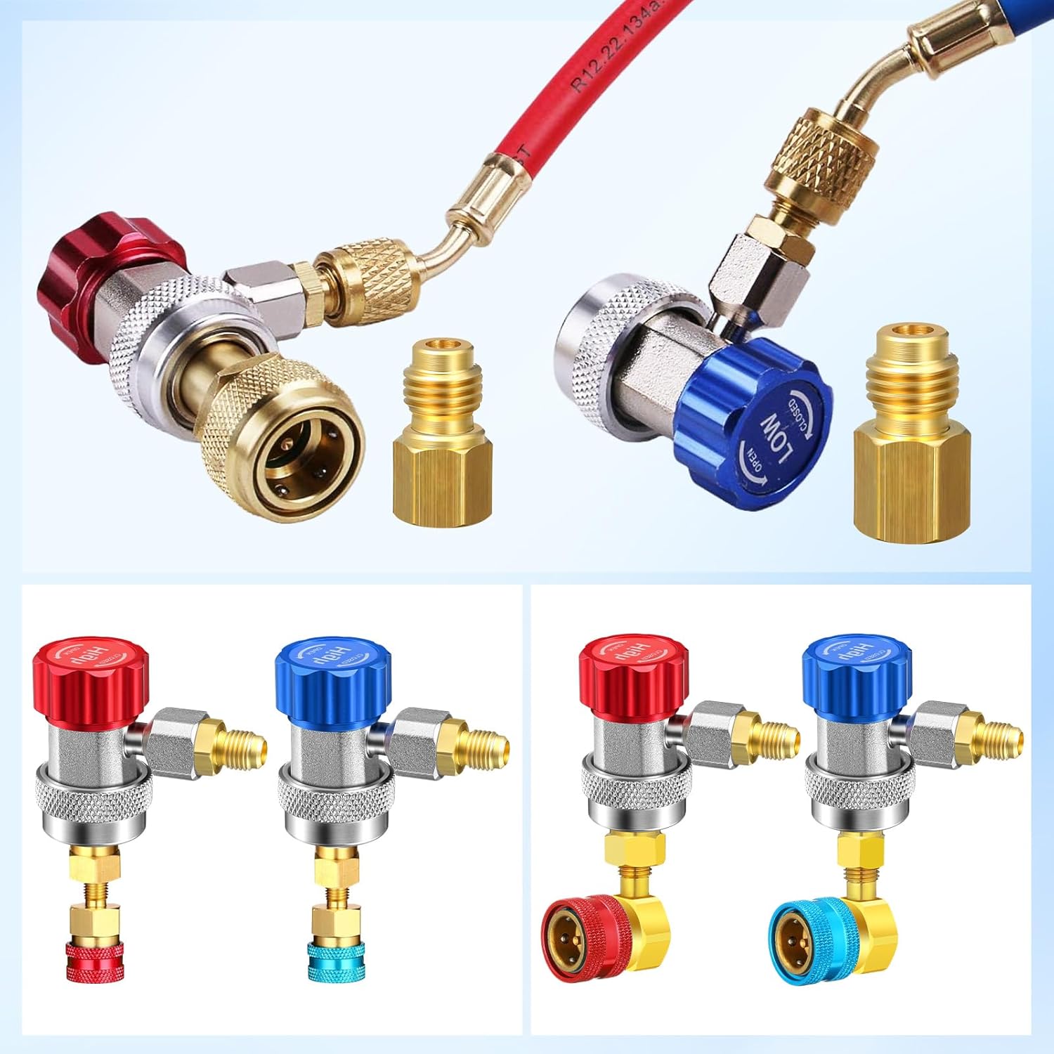 Features: Made of copper and aluminum alloy for long lasting, featuring temperature resistance and corrosion resistance, r134a and r1234yf adapters will stand heavy use in garage. The internal and external threads are deep and precise for suitable matching and replacement, easy and durable to use. Specifications: Material: copper and aluminum alloyColor: as pictures shownSize: Self-sealing can tap valve: 1/4 inch male fittingHigh and low pressure quick couplers: 1/4 inch male fittingTank adapter: 1/4 inch female fitting to 1/2 inch male and 1/4 inch female fitting to 1/2 inch male fittingPackage includes: 1 Pair of r134a high and low pressure quick couplers1 x R134a puncture can tap1 x R134a self-sealing can tap1 x Valve core remover1 Pair of r1234yf high and low pressure quick couplers1 x R1234yf puncture can tap2 x Tank adapters5 x R410/r22 valve cores5 x R134a valve coresNotes: Manual measurement, please allow slight errors on size. The color may exist a slight difference due to different screen displays.