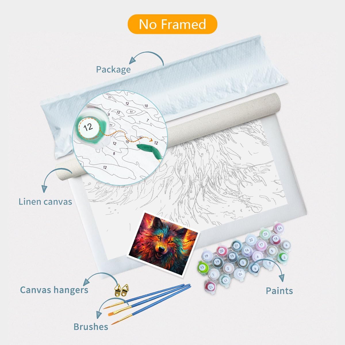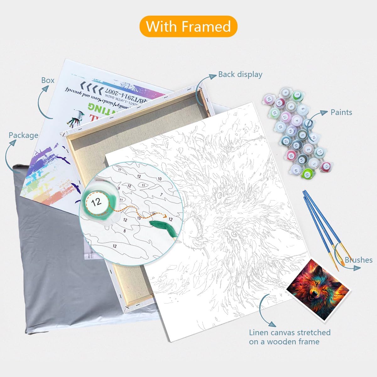 How to paint by number? 1. You can decide the order of drawing according to your personal preferences or according to the numbers. 2. For white paint and other light-colored paint parts, the figures left on the canvas may be visible, you can use the paint twice and try to cover with the thick paint. 3. Use the paint directly and do not add water. 4. Match the paint number and the figure on the canvas to fill the paint. 5. If you made the mistake of filling the wrong color, you can wait for the paint to dry and then cover the wrong part with the correct color. 6. Wash the brush thoroughly when you change color. 7. For the large part, you can use the larger brush to paint, and for the small part, you can use the smaller brush to paint. 8. Wash the brush thoroughly every time you finish painting for next use. 9. If you have paint on your clothes, wash them immediately. 10. Please cover the paint cover well when not in use, in case the paint dries. 11. Figures on the canvas may not be fully covered, I hope you do not mind. 12. The paint we offer is enough for normal use, please do not waste it in case of paint shortage.