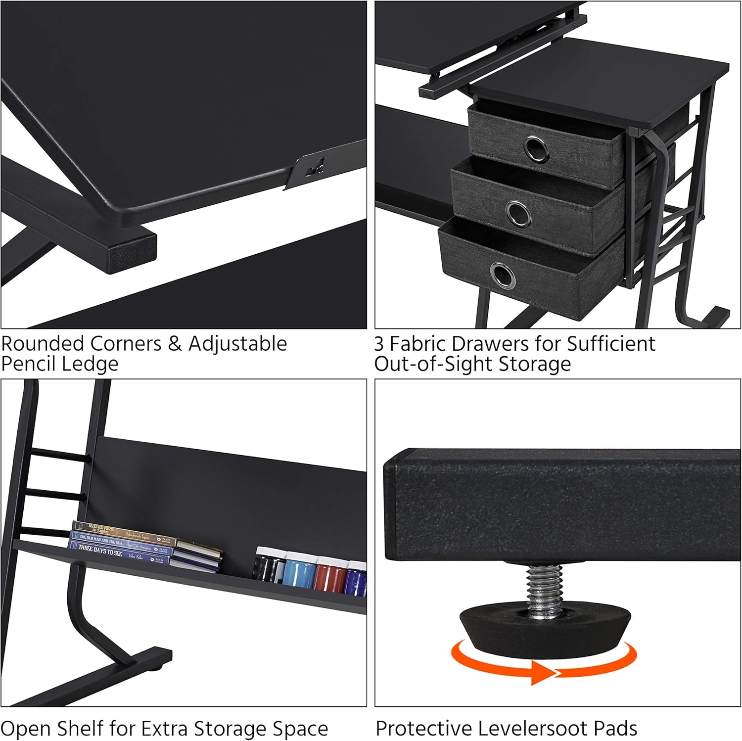 Drafting Table & Stool Set For Artists Tilting Tabletop with Additional Side Countertop & 3 Drawers & Extra Storage ShelfQuick overview:Having a versatile drafting table like this may help your work move to the next level! This drafting table features a tilt angle adjustable tabletop that raises from 0 to 40-degree for different purposes. It serves perfectly as a tilting drawing table, or a spacious writing/computer desk. Its functional construction accommodates art supplies, computer, laptop, books, and more. Specifications:Color: black table, black stoolMaterial: powder-coated steel, PVC-coated MDF, PU leather, foam, non-woven fabricTabletop tilt angle: 0-40 degreesOverall dimension: 128x60x(75.5-111)cm/50.5x23.6x(29.7-43.7)’’ (LxWxH)Stool size: 41.5x41.5x53.5cm/16.3x16.3x21’’ (LxWxH)Tabletop size: 90x60cm/35.4x23.6’’ (LxW)Side countertop size: 40x36cm/15.7x14.2’’ (LxW)Drawer size (ea.): 33x33x10cm/13x13x4’’ (LxWxH)Maximum weight capacity: tabletop: 72kg/158.7lb; stool: 120kg/265lbG.W.: 25.4kg/55.9lbNote: Please allow 0.3cm/0.2'' errors due to manual measurements.Package included:1 x Drafting table1 x Stool1 x Instruction