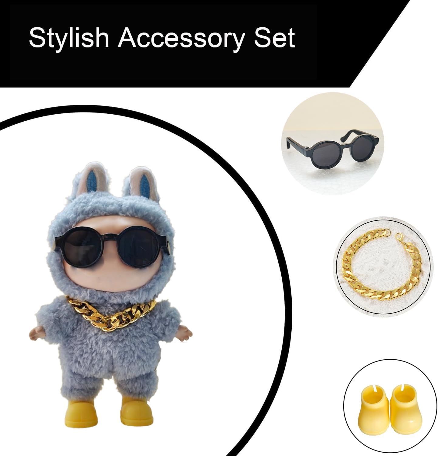 Turn your doll into a fashion icon with this Trendy Doll Outfit Set, a must-have collection of stylish accessories that instantly upgrade your doll’s look. Featuring a pair of cool sunglasses, a glamorous gold necklace, and a pair of vibrant yellow shoes, this set is perfect for creating unique, eye-catching styles.Whether your doll is rocking a punk look, a casual vibe, or an elegant chic style, this set offers endless possibilities for customization. Use it for photography, creative storytelling, or simply to show off your doll’s style on display.Each accessory is made with premium materials, ensuring long-lasting durability and detailed craftsmanship. This set is an excellent choice for doll lovers looking to expand their collection with fashionable, mix-and-match options.