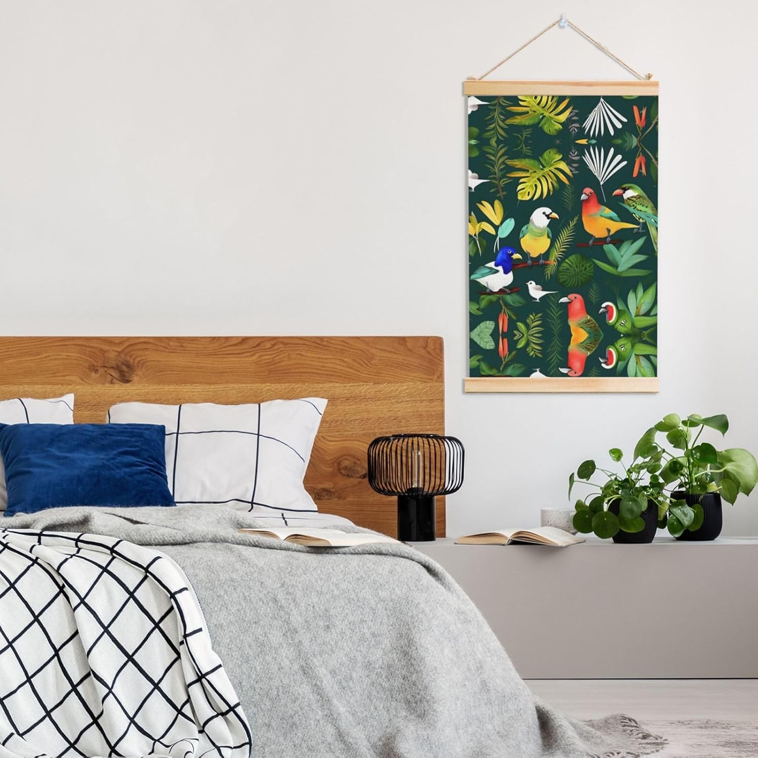 Our Tropical Birds And Plant Leaf Print Wooden Poster Hanger Is An Excellent Addition To Your Home Decor Or A Perfect Gift For Friends And Family. Made Of Selected Quality Canvas With Brilliant And Enduring Colors, This Wall Art Is Designed To Resist Water, Dust, And Fading, Ensuring The Bright And Vibrant Art Lasts. The Polyester Is Enclosed Between Two Teak Wood Hanger Scrolls With An Attached 35cm Rope For Easy Hanging. Installation Is Made Simple With The Included Two Nails In A Plastic Box. The Modern Minimalist Style Of Our Wall Hanging Complements Any Home Decor, Elevating The Artistic Ambiance And Brightening Up The Room. Experience The Elegant Transformation This Wall Hanging Scroll Painting Brings To Your Spaces Today.
