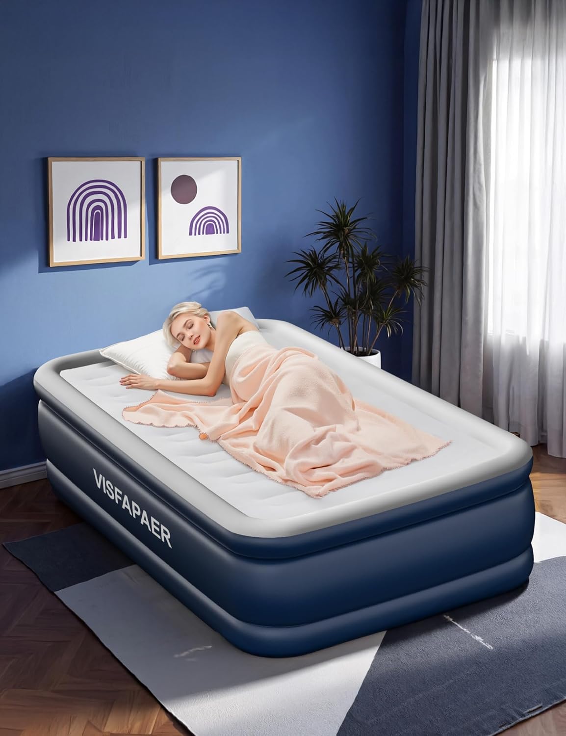 The VISFAPAER Air Mattress combines stability, comfort, and convenience for an exceptional sleeping experience. Its honeycomb structure ensures stable support and all-night comfort. A built-in high-powered air pump allows quick inflation in about 1-2 minutes, with a built-in compartment for clutter-free cable storage.
