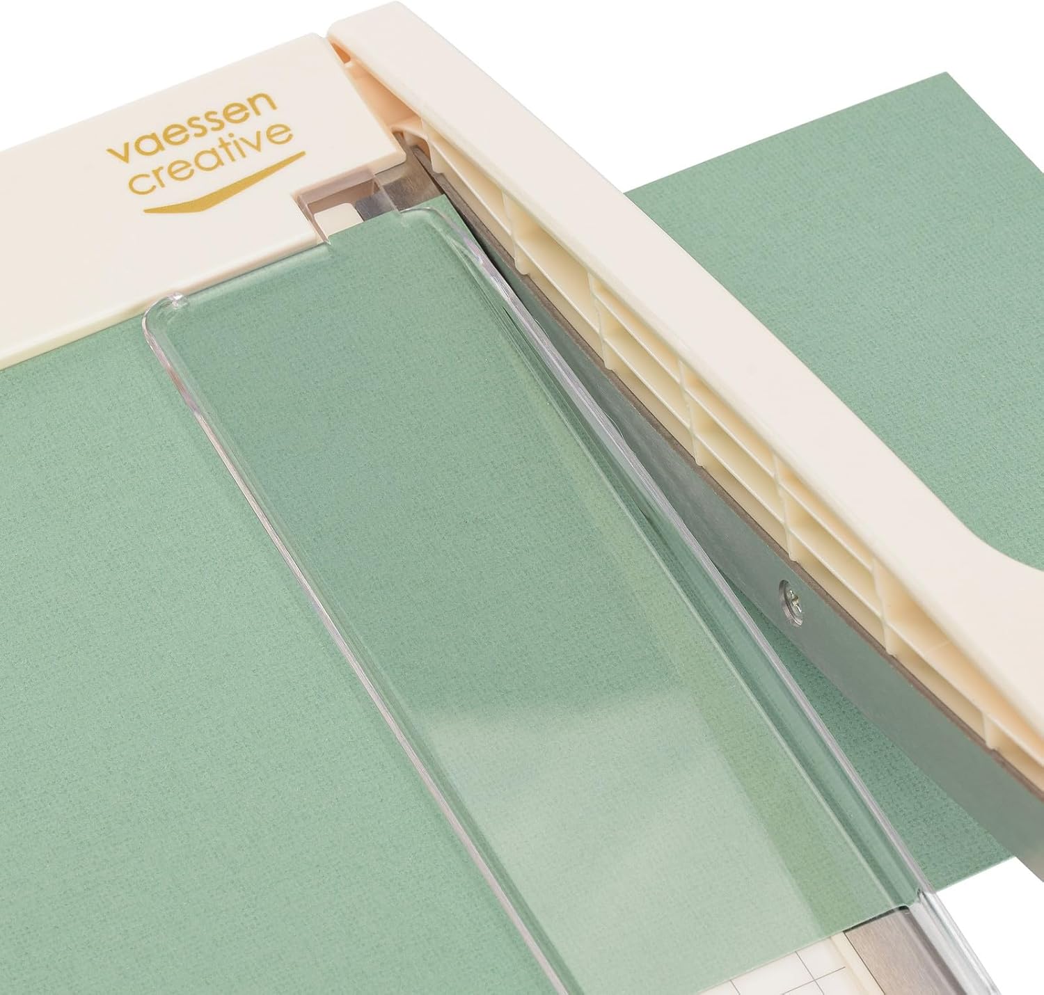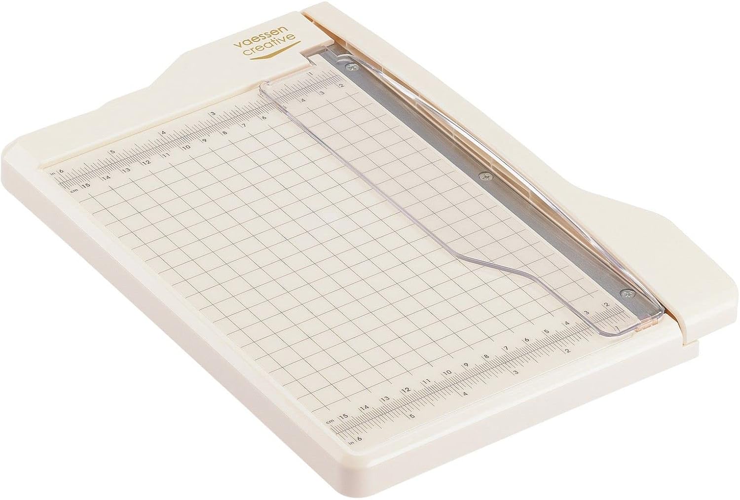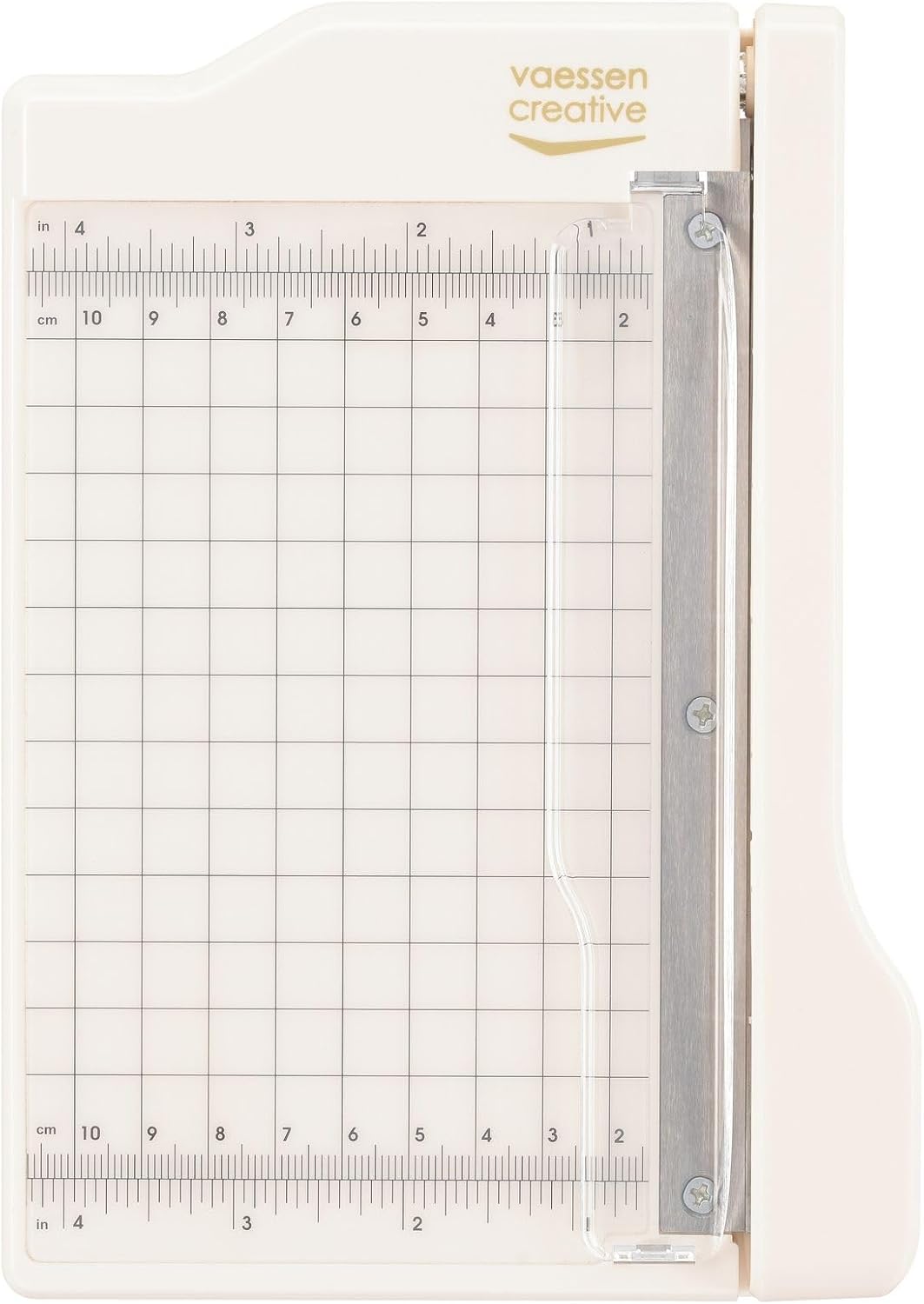 The Trim Easy Guillotine Cutter is a handy craft tool for accurately cutting paper, cardboard, cardstock, scrapbook paper, foam, cork sheets, felt and vinyl. The board measures 6 x 8.5 inches (15.2 x 21.6 cm) and is suitable for cutting up to A5 size. Ideal for making cards and scrapbook designs, gift tags, embellishments and creating other paper craft projects, such as bullet journals, planners and photo albums. The paper cutter has rulers along the top and bottom of the lightweight plastic base with metric and imperial measurements for accurate cutting. The base has a grid printed on it to aid placement. Simply press down and trim up to 7 sheets of 80 gsm paper at a time. The self-sharpening cutting blade is long-lasting. The transparent safety guard keeps fingers at a safe distance from the razor-sharp guillotine blade while giving a clear view of the trim line for an accurate finish every time. The safety guard doubles as a paper clamp and smudge guard. Mounted on non-slip pads for stability. Great portable guillotine for taking to crops and retreats. The guillotine can be hung for storage.