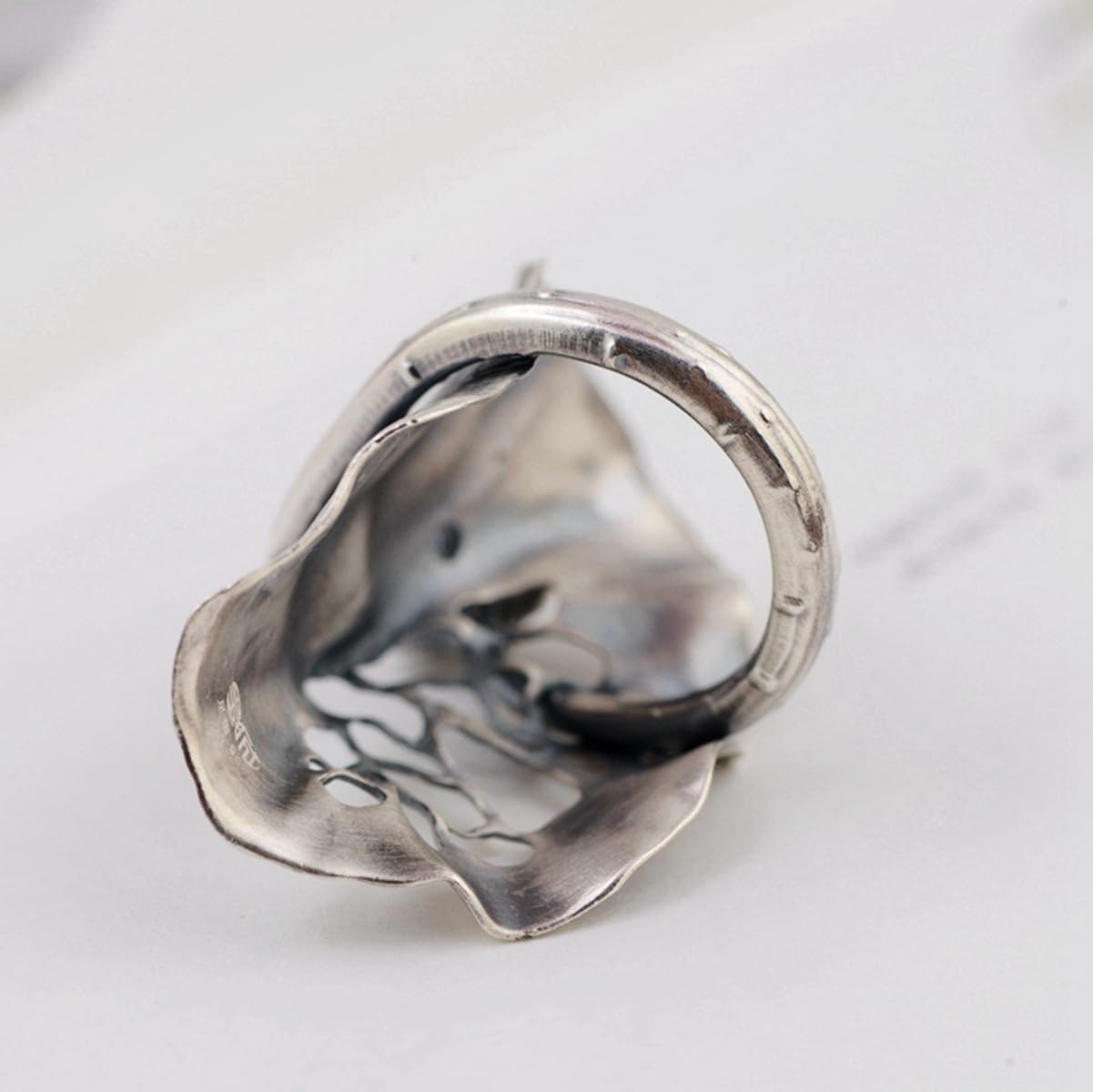 Vintage Large 990 Sterling Silver Lotus Leaf Wrap Ring with Natural Green Jade Punk Jewelry for Women Open Adjustable