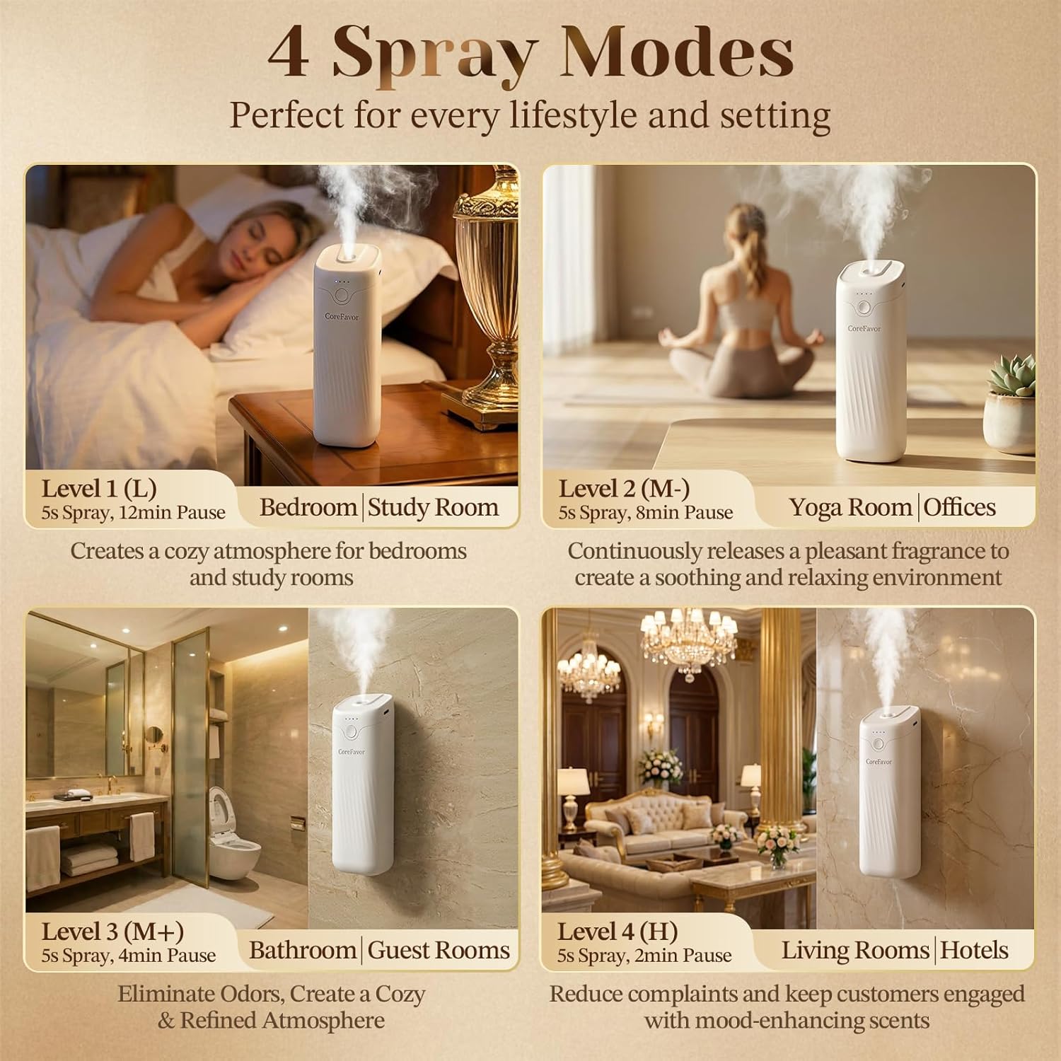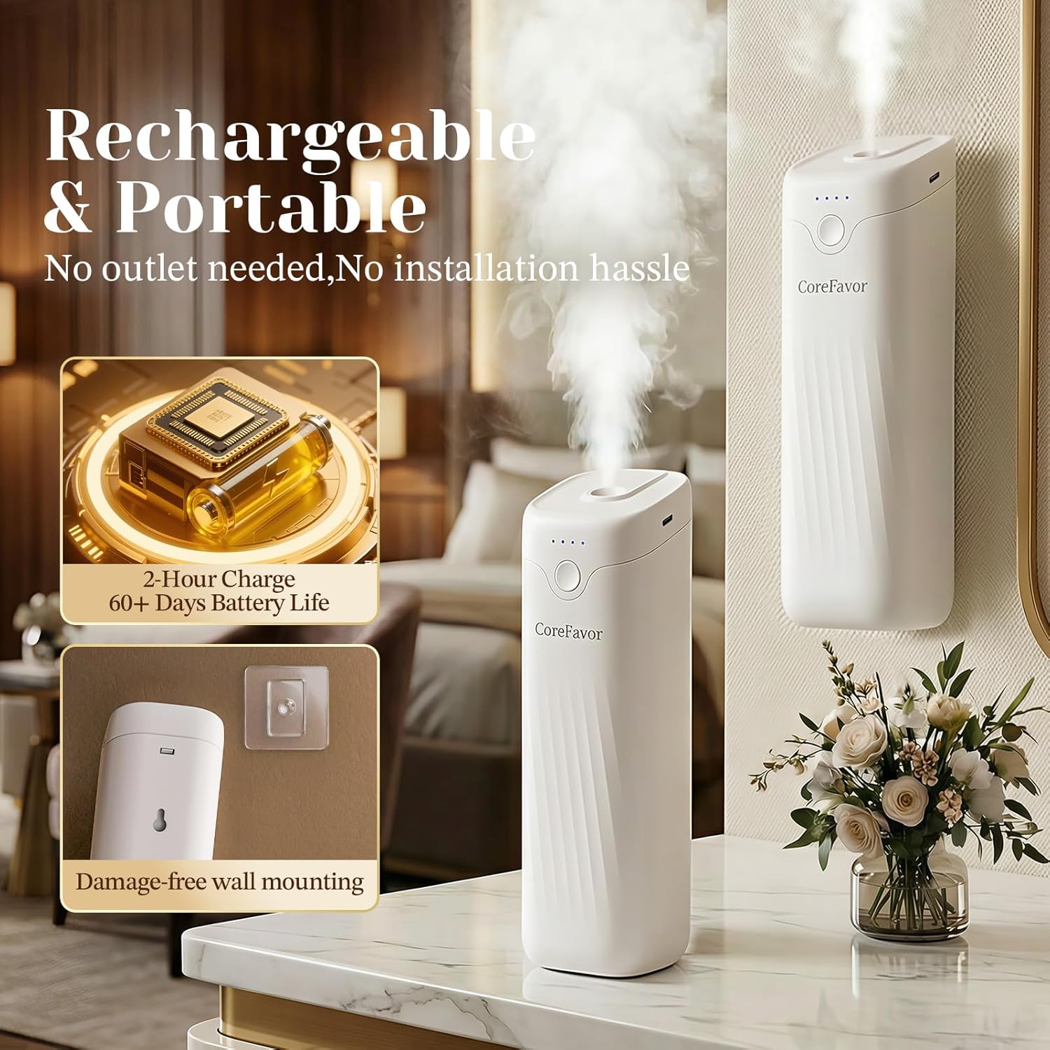 This Smart Automatic Aroma Diffuser offers effortless fragrance diffusion with simple one-button control. The intelligent spray system automatically releases scent at set intervals, providing a consistent and comfortable aromatherapy experience without manual adjustments. Using advanced ultrasonic technology, it transforms essential oils into a fine mist for even fragrance coverage across bedrooms, bathrooms, living rooms, offices, or cars. With 4 adjustable scent intensity levels and a smart work/rest cycle, it easily adapts to different room sizes and preferences. The rechargeable, cordless design allows flexible placement, while the included adhesive mount supports both tabletop and wall-mounted use. Designed for quiet operation, this diffuser is ideal for sleep, work, relaxation, or daily use without disturbance.