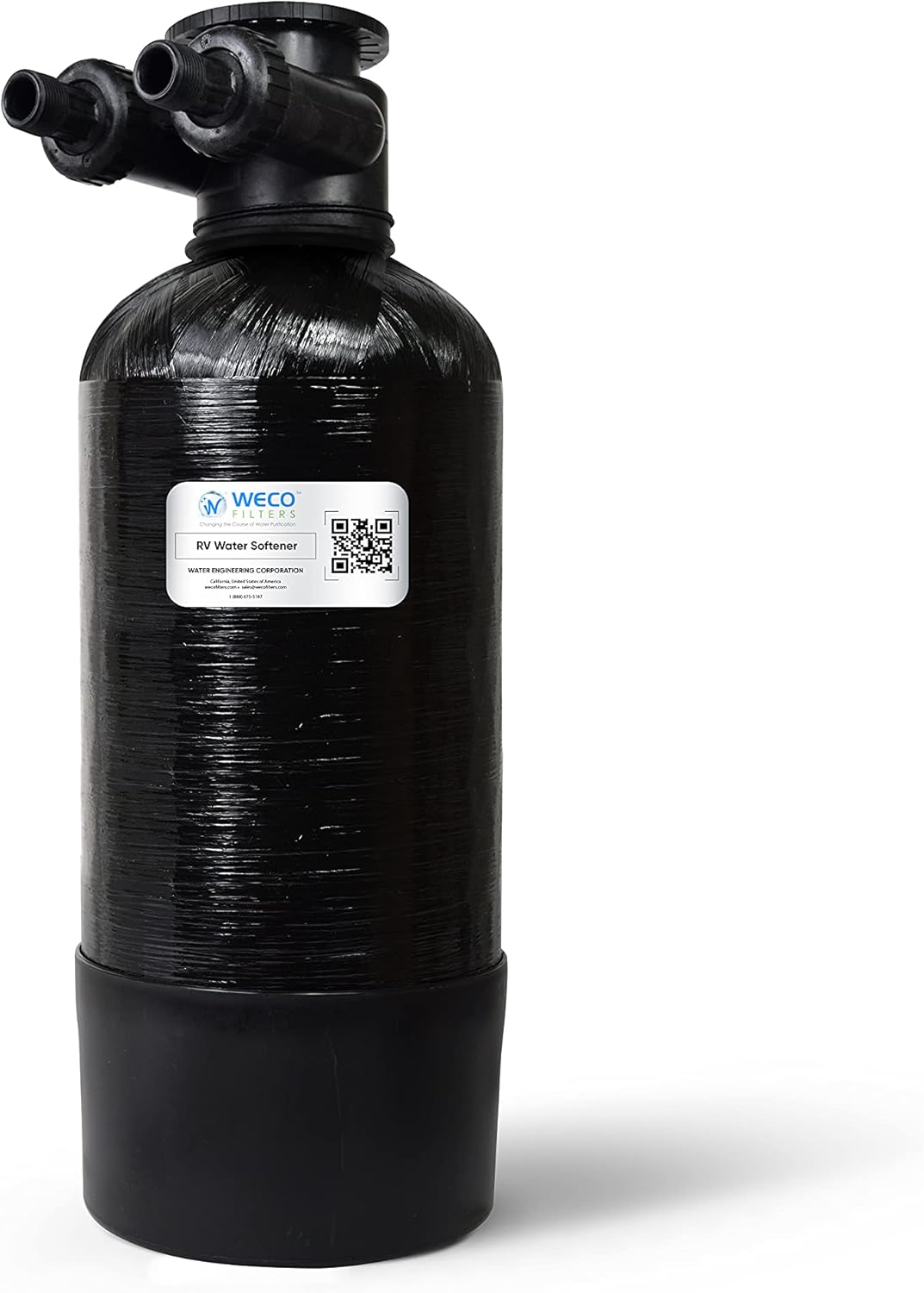 Mini portable ion exchange water softener for RVs, motor homes, trailers, campers. Simple in/out design with a fill port for salt recharge. Removes calcium, magnesium and low levels of iron from water.