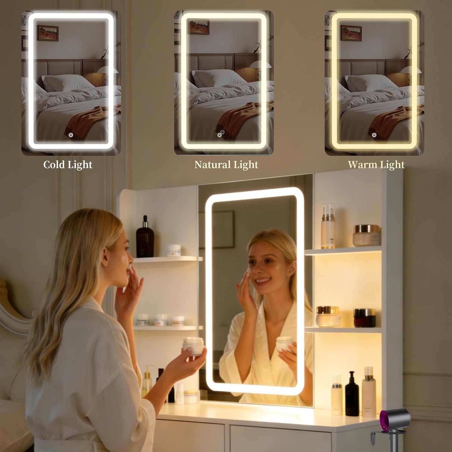 | Included Components | HD Glass Mirror with LED Lighting, Leather stool, Remote controlled ambient light, hardware, power strip |