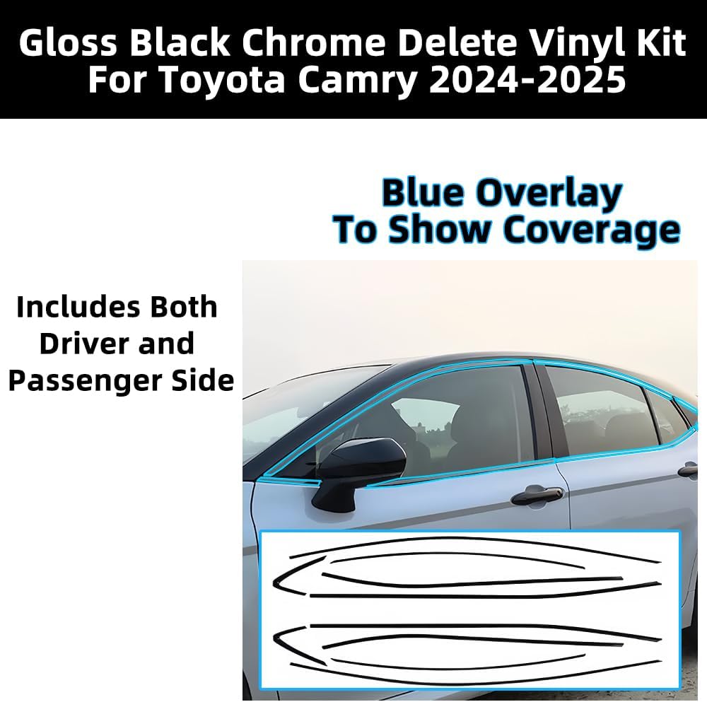 Material Quality - Made of vinyl, anti cracking, non fading.Excellent Function - Fit for 2024-2025 9th Gen Toyota Camry , it not only beautifies the window strips but also effectively avoids scratches on the edges of the windows. Improve the aesthetics of the car.Seamless Fit - Precision Cut made for your trim. The stretchy flexible material is easily adjustable and will conform to the shape of your car's trim. No need to cut the vinyl into shape, just align the sticker with the car window.In order to improve fault tolerance, extra dimensions may be reserved and some areas may require the use of small knives for cutting.Easy to Remove - Just peel off the sticker slowly. If the adhesive is too sticky, you can use a hair dryer to properly heat the surface of the sticker and then gently tear it off. The removal will not leave traces.Installation method-Step 1:Clean the dust from the car and wait for it to dry completely.Step 2: If necessary, apply adhesive aid and wait for it to completely dry before sticking.Step 3:Align the position, stick one side well, and slowly stick towards the other side.Step 4: Press firmly at the corner and heat it up with a hair dryer.Step5: Use a scraper to press the corners of the sticker tightly.Step6: Tear off the transparent film on the surface of the film.( To avoid scratches, our film has a transparent protective film on top. Please remove the surface transparent film after installation.)Installation Includes -1 pair of window trim chrome delete(Left & Right Side)+Provide a backup to avoid malfunctions.Knife * 1, scraper * 1