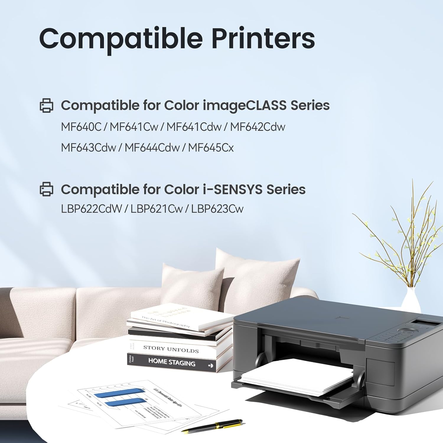 | Compatibility Options | Compatible for Canon Color imageCLASS MF640C, MF641CW, MF642Cdw, MF643Cdw, MF644Cdw; LBP620, LBP622Cdw, LBP623Cdw |