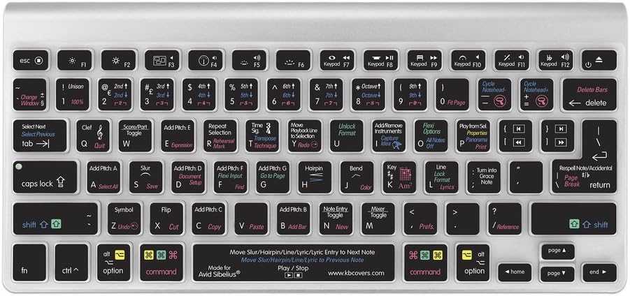 Designed in conjunction with Sibelius Trainer Marc Schonbrun, author of the Master Sibelius series, the Sibelius Keyboard Cover includes over 110 keyboard shortcuts. Compatible with Sibelius version 5, 6 and 7, the KB Covers keyboard shortcuts are color coded, so users know when to use modifier keys like Shift or Command to get the desired result. With the Sibelius Keyboard Cover, users can focus on composing, arranging and publishing and not be slowed down by using the mouse or trying to memorize keyboard commands. Best of all, you'll learn Sibelius faster than you ever thought possible! Utilizing a multi-color printing process, the editing keys are color-coded and heat fused to ensure long lasting durability. KB Covers are made of durable, ultra-thin clear silicone and perfectly molded to fit both the US and European/ISO Apple MacBook, MacBook Pro (Unibody), MacBook Pro Retina (Unibody) and MacBook Air 13. They will not slip or slide . In addition, the covers have a silky smooth feel so they are soft and comfortable to the touch and will not restrict typing. KB Covers keyboard covers also safeguard your keyboard from dirt, spills and wear and tear, allowing you to protect your investment in your notebook computer. They are hand washable and easy to keep clean. We've got you covered.