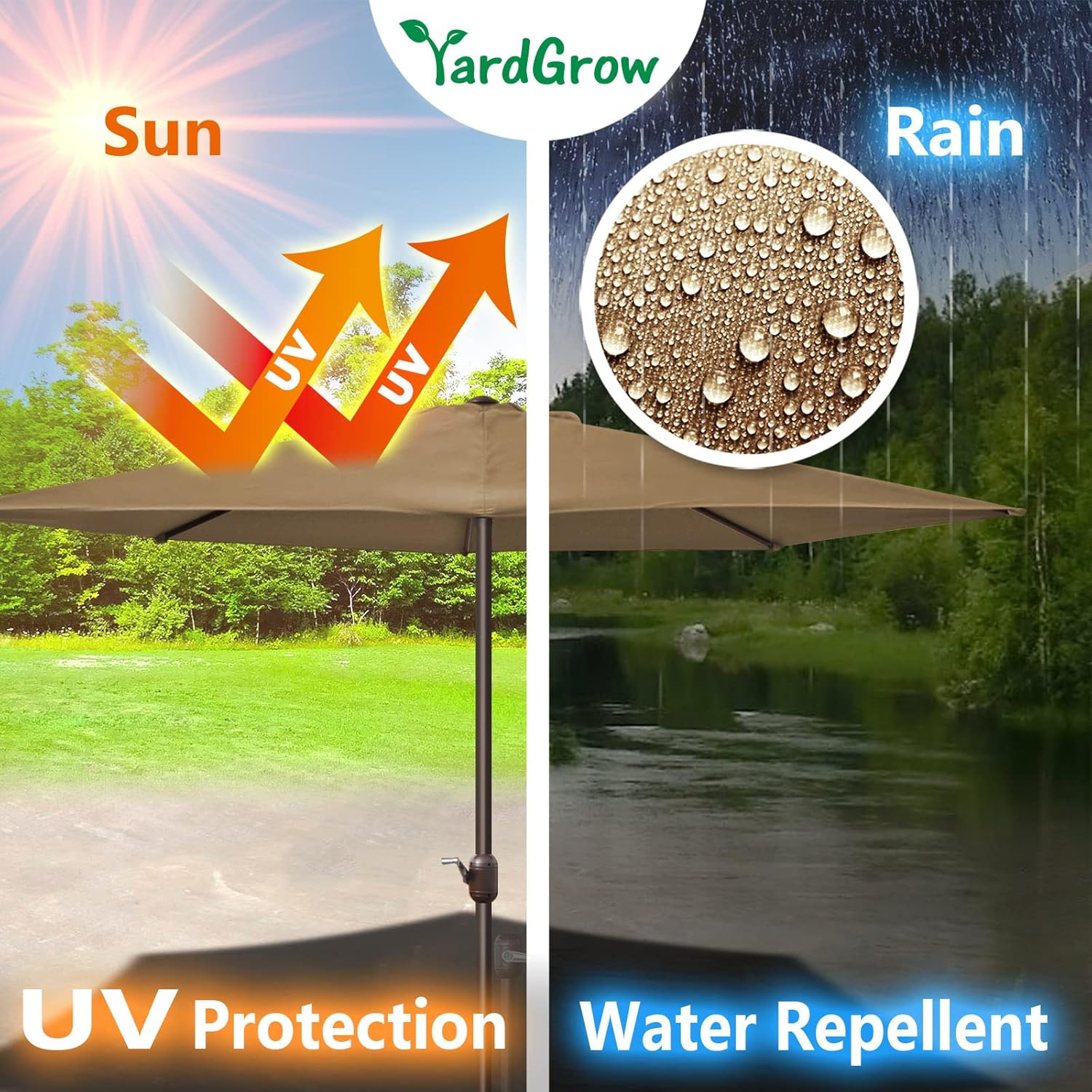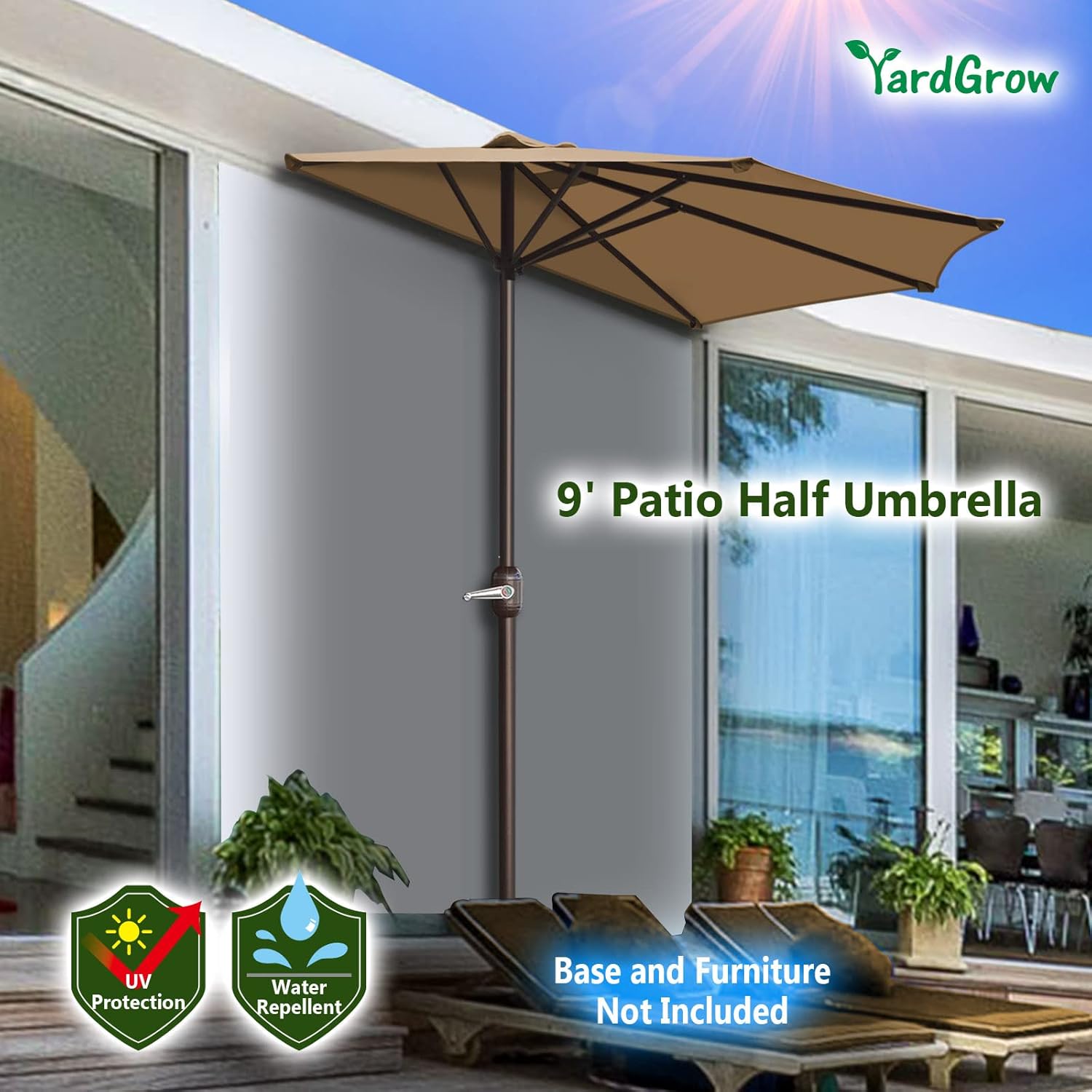 YardGrow half umbrella adds shade to your balcony or other narrow space.PLEASE NOTE: This version without umbrella base!!!Features:- UV30+ 160g/sqm anti-fade polyester umbrella canopy- More effectively for UV blocking.- Crank handle for convenient raising and lowering.- Air vented at the top, cool and can withstand sudden gust.- More Firm and durable umbrella top finial.- Can be mounted on your existing stand or in the middle of table if hole available. (38mm pole dia)OVERALL DIMENSIONS(Open): Canopy diameter: 9FTUmbrella height: 7.5FTNO-WORRY Customer Service:If you have any question of this product or your order, please feel free to contact.Our customer service team will surely assit you with your problem to your satisfaction.