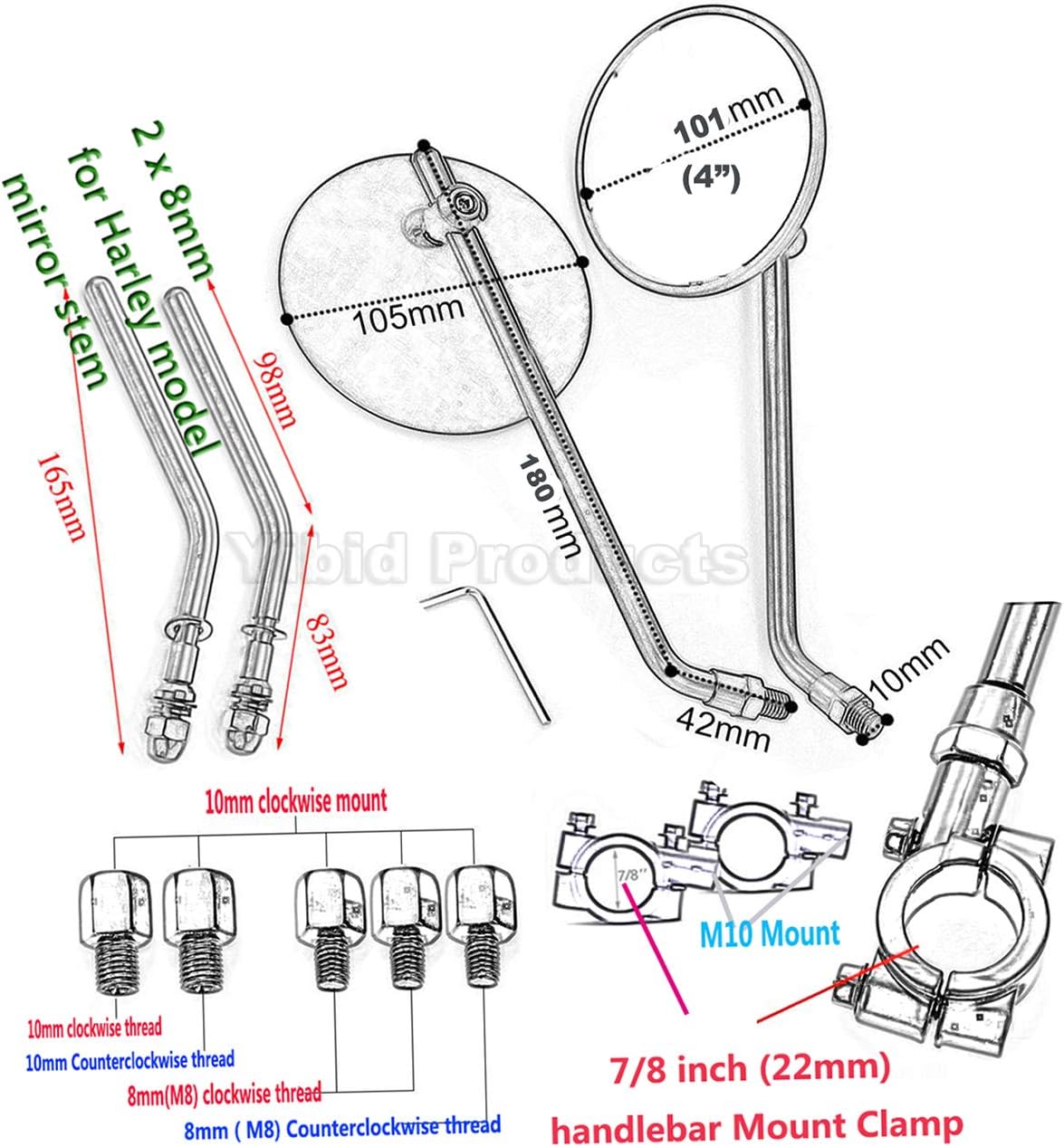 | Included Components | 1 Sets (Left and Right) mirrors, 2 x 8mm Harrlay model mirror stems, 1 x 10mm Clockwise Bolts & 1 x 10mm Anti-clockwise Bolts, 2 x 8mm Clockwise Bolts & 1 x 8mm Anti-clockwise Bolts, 2 x 7/8inch(22mm) Handlebar mount clamps, 1 x Wrench |